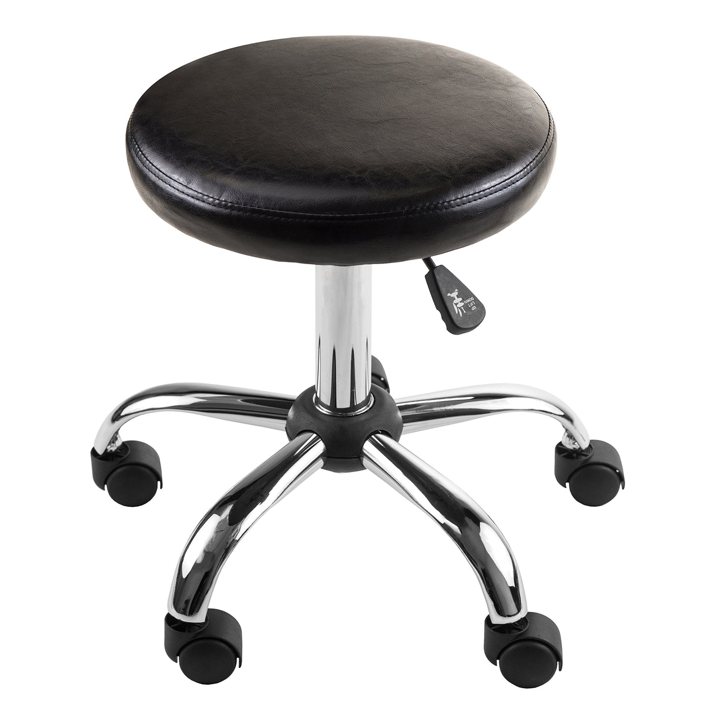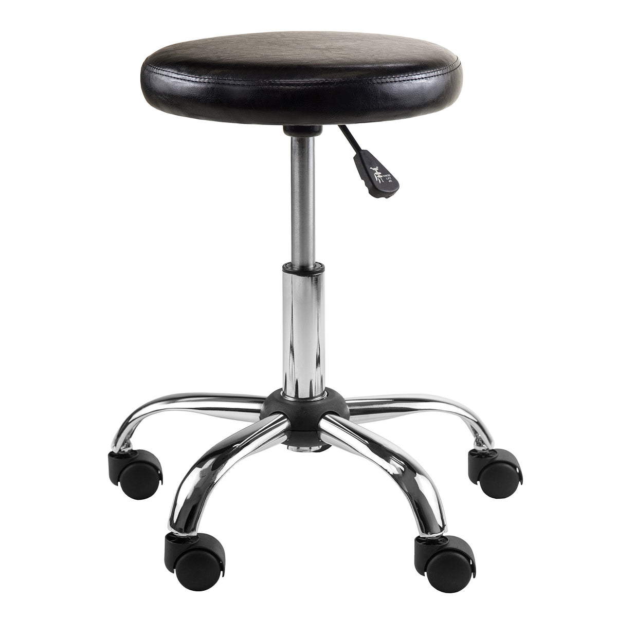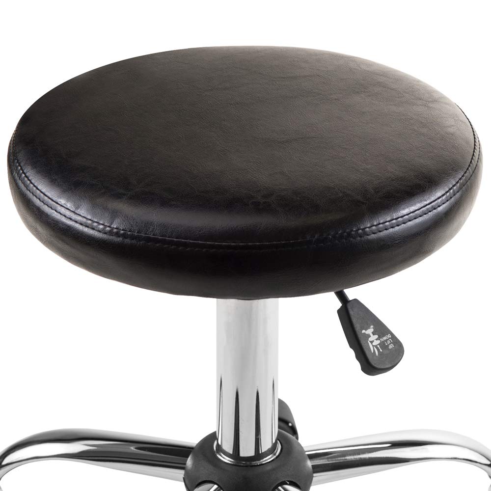 Comfortable, black faux leather cushion seat stool with adjustable height set on casters for easy mobility. Full 360 degrees swivel. Great way to add convenient and efficient task seating to a classroom, office or other workspace.