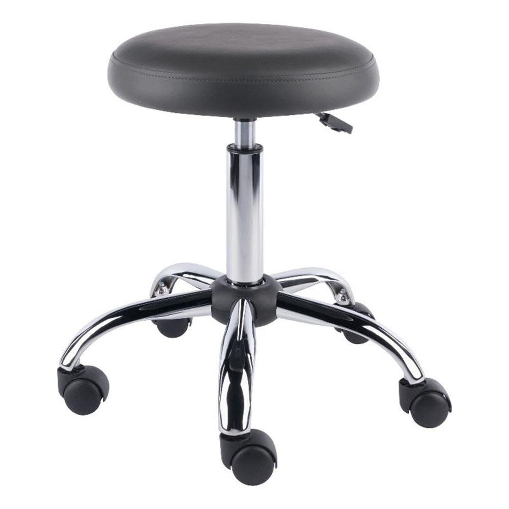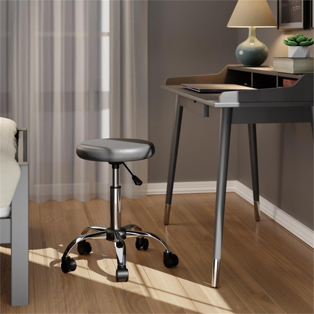 The Clyde Adjustable Swivel Seat Stool is the answer for your busy, multi-tasking life. Move easily from one work station to another in an office, salon, warehouse, or behind a retail counter. The hydraulic lift lets you raise or lower the seat from 19.3" to 25.6" with a simple lever. And the seat rotates 360 degrees to suit whatever angle you need. The stool moves easily and smoothly on the hooded casters without scratching the floor. The cushioned seat is made of faux leather in a contemporary charcoal finish, complemented by the chrome base. Sturdy, but lightweight enough to move wherever you need flexible, mobile seating. Conveniently packed in one box with all the hardware needed for assembly. Overall size: 22.5"W x 22.5"D x 19.3"H (lowest)- 25.6"H (highest) Seat diameter: 13.7" Footprint diameter: 20.1" Static weight capacity 220 lbs. Seat material: Faux leather (Polyurethane) Assembly required Ships in 1 box