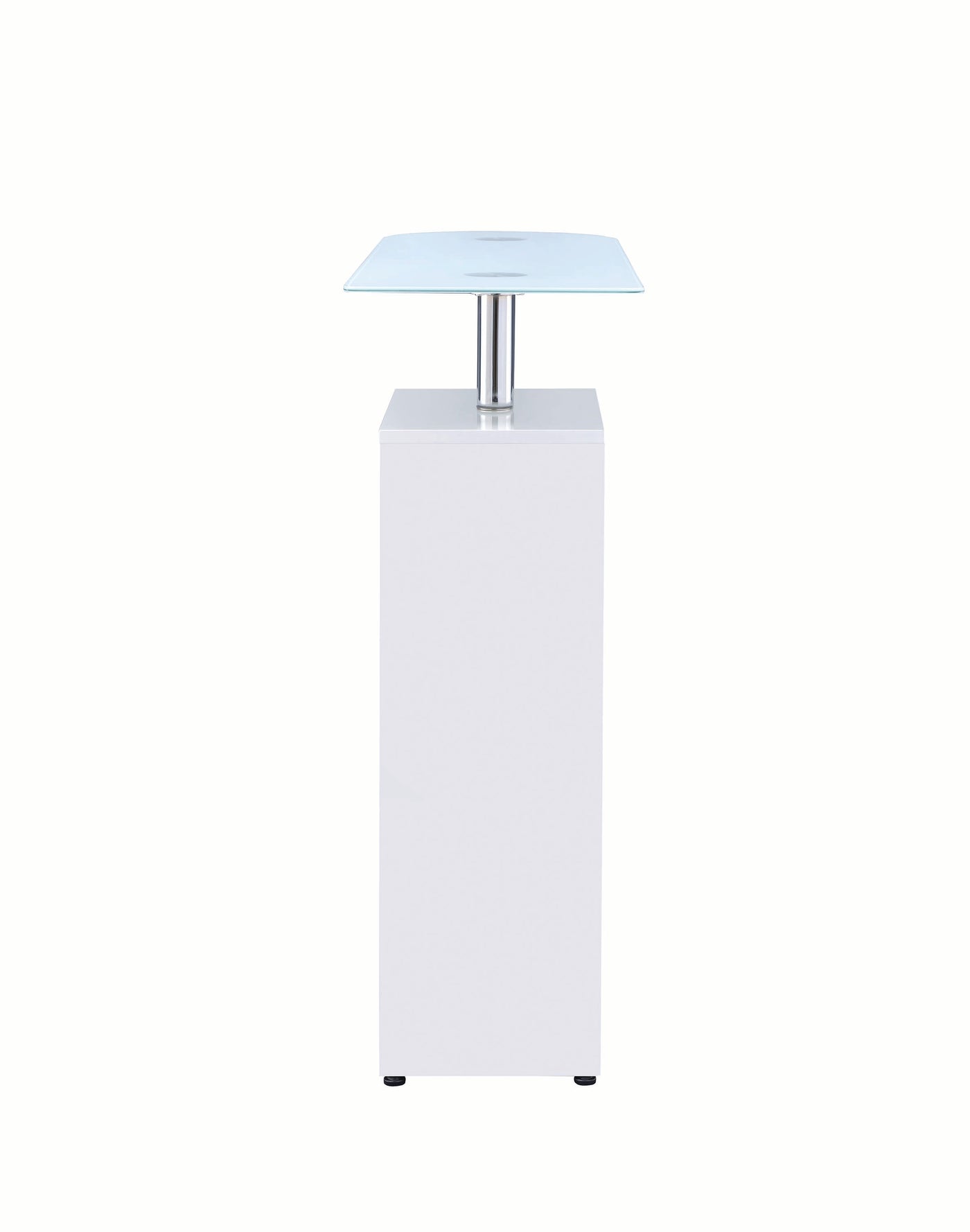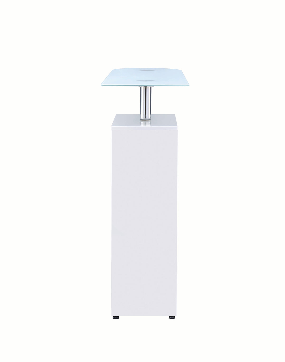 Create a relaxed spot for sipping a cocktail or catching up with a friend with this contemporary bar table. Offering an appealing look and plenty of storage, the table features an elevated glass top with a cabinet under one side. In a high gloss lacquer finish, the cabinet delivers stemware storage and a wine rack, perfect for showing off favorite vintages. An included drawer in the base of the cabinet is perfect for tucking away bar accessories. Relax with a friend or enjoy pouring a favorite merlot at this stylish bar table.