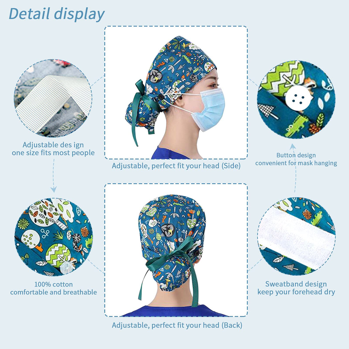 Scrub Hats Ponytail Pouch & Button Design: This Is A Comment From A Customer: (It Is A Very Good Solution For People With Long Hair. Hair Conveniently Goes Into The Hair Pouch And It Gets All My Hair Covered, Which Is Important For Me In The Area That I Work. Buttons For The Mask Keeps My Ears Spared Of Hurting In The End Of The Day. I Like The Designs As Well ) Makes You Look Professional And Brisk,When Working,Scrub Caps It Can Prevent Falling Hair, And The Production Is More Safe And Hygienic Scrub Caps Women [Premium Material & Adjustment] 100% High-Grade Cotton Fabric, Light, Comfortable & Breathable, Fast Dry. Foheel Style Bouffant Hat Have An Elasticized Band And Ties In The Back That Can Be Worn Two Ways: Tied Loosely In Back Or Tied Up In A Ponytail. One Size