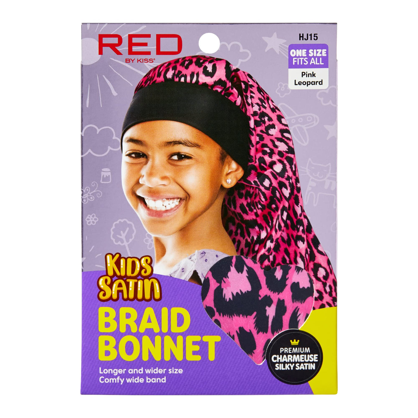 Red By Kiss Kids Satin Braid Bonnet, Comfy Wide Band For Long Hair, Long Braids (Pink Leopard)