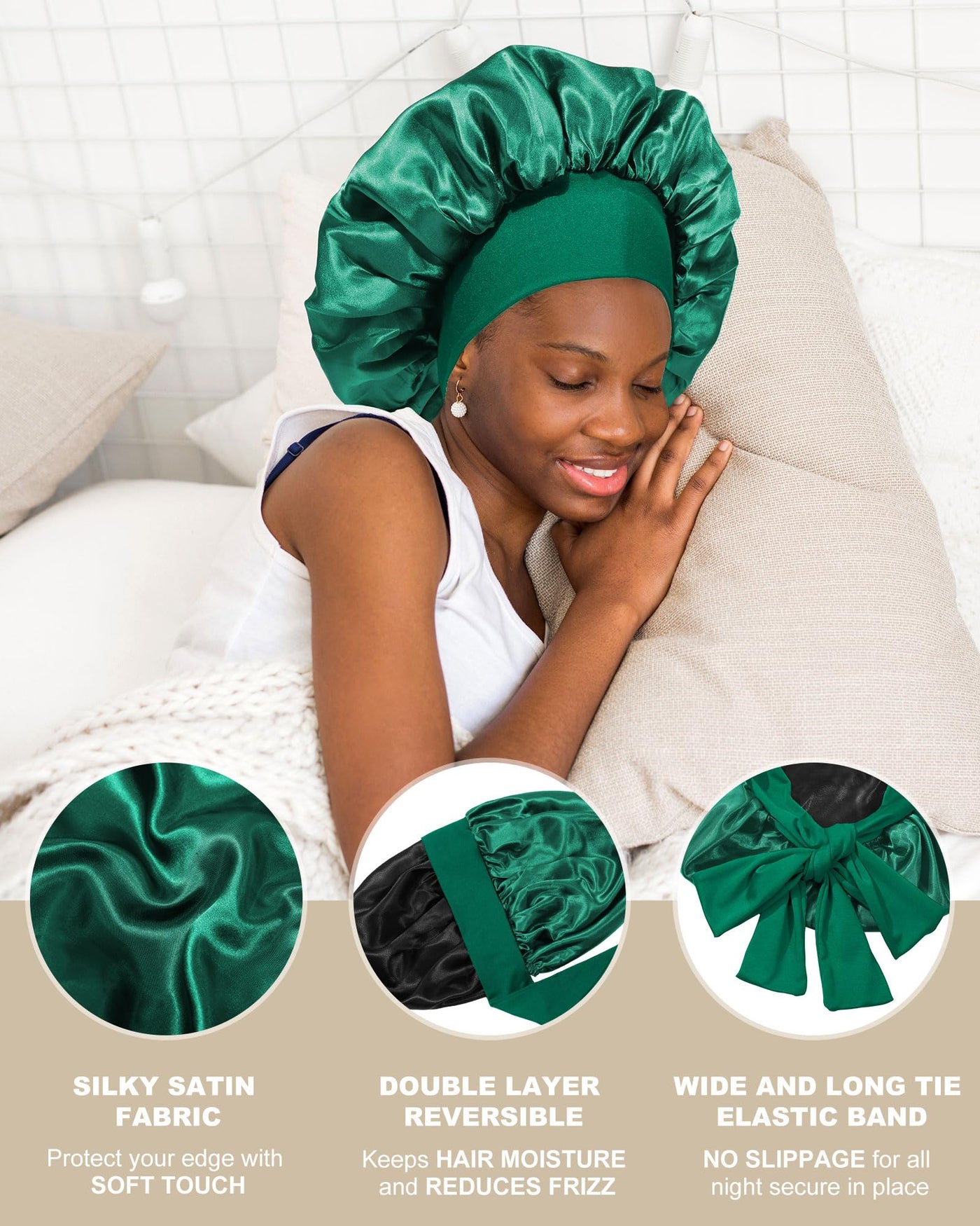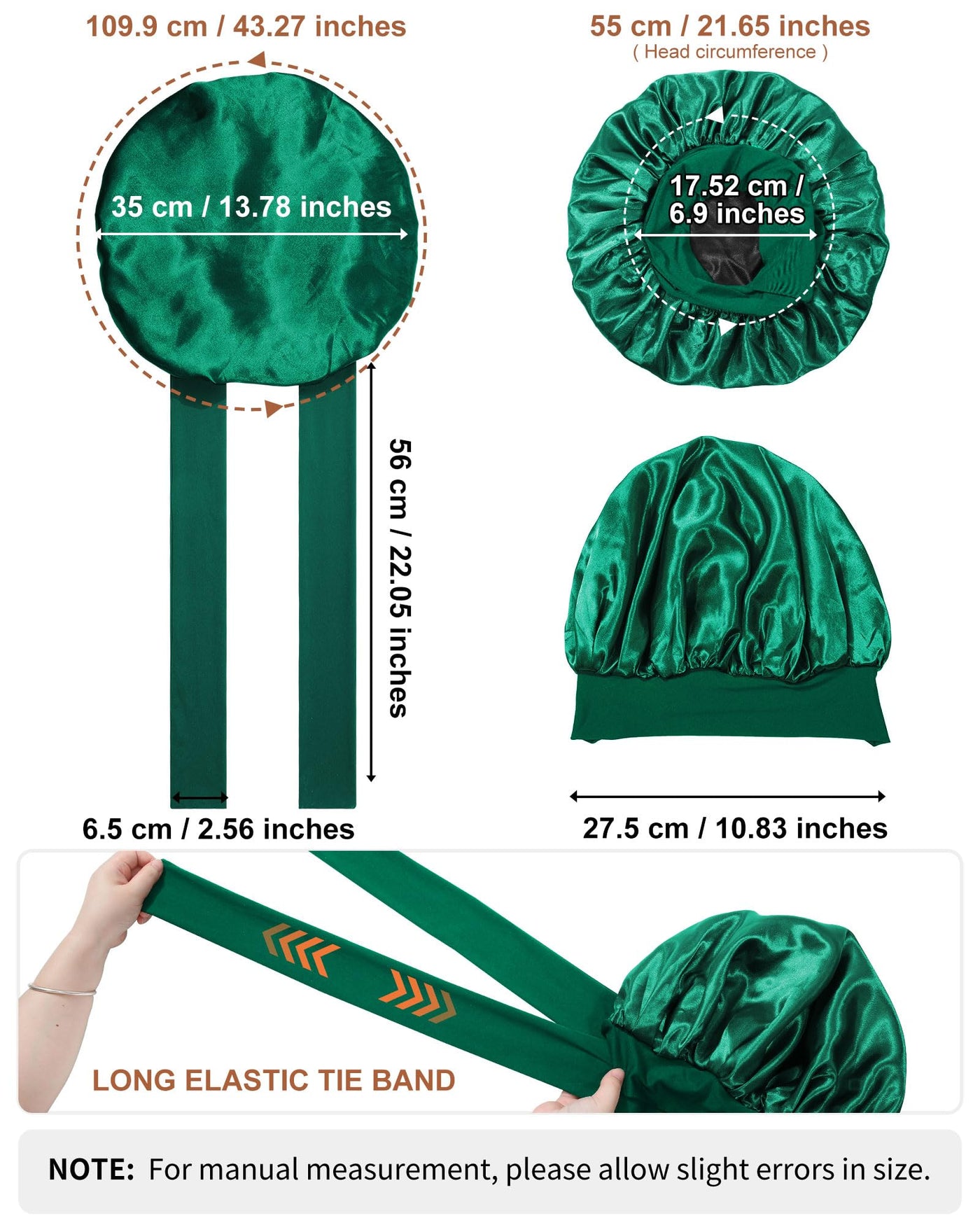 Specifications: Material: Satin Size: 21.65 Inches / 55 Cm Package Includes: 1 X Satin Hair Bonnet For Sleeping Product Feature: ?Double-Sided Two-Color Sleeping Cap For Your Choice? A Silk Bonnet For Curly Hair Front And Back Two Colors Can Be Worn, Value For Money. ?Double-Sided Design? Satin Bonnet For Curly Hair Sleeping Are Dual-Layer Satin, Are Not Only More Beautiful And Stylish But Also Can Wrap More Hair, Use The Hair Mask After Sleeping Will Not Get Dirty Bed Sheets. ?Material? The Silk Hair Wrap For Sleeping Is Made Of Satin, Soft, Smooth, Breathable, Lightweight, And Has Good Elasticity. It Allows You To Reduce The Friction Between Your Hair And The Pillow When You Sleep, So As To Protect Your Hair And Prevent Your Hair From Being So Dry. ?Multiple Uses? The Satin Hair Bonnet For Sleeping Is Suitable For Sleeping, Housework, Make-Up, Face Washing, Skin Care, Yoga, Etc. This Sleeping Cap Is Also Suitable For Cancer And Chemotherapy Patients. ?Washing Instructions? Hand Wash In Cold Water Or Machine Wash On A Gentle Cycle. ?Applicable Hair Type? Long Hair, Short Hair, Straight Hair, Curly Or Wavy Hair, Thin Hair, Medium-Thick Hair, Thick Hair, And Extra Thick Short Hair. ?Applicable People? Girls, Teens, Women, Ladies, Mothers, And Daughters. ?Perfect Gift? Wonderful Gift At Birthday Parties, Christmas, Valentine'S Day, Mother'S Day, New Year'S Day, And Other Festivals. Warm Notice: 1. The Colors May Exist Slight Differences Due To Different Lighting And Screen. 2. For Manual Measurement, Please Allow Slight Errors In Size. 3. Washing Instructions: Machine Wash Or Hand Wash. Our Service: 1. If You Are Not Satisfied With Our Satin Hair Wraps For Women, Please Let Us Know. 2. We Will Reply To You Within 24 Hours And Give You A Solution You Like.