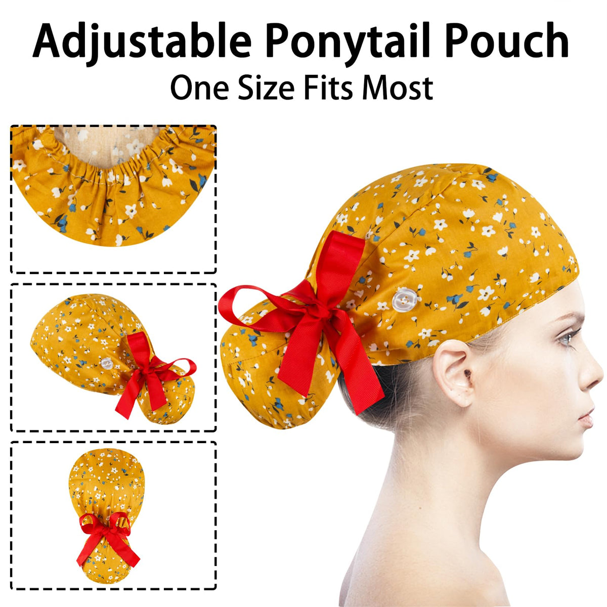 Scrub Caps Women Bouffant Scrub Hats Caps Nurses, Adjustable Working Cap Ponytail Pouch Tie Back Hats