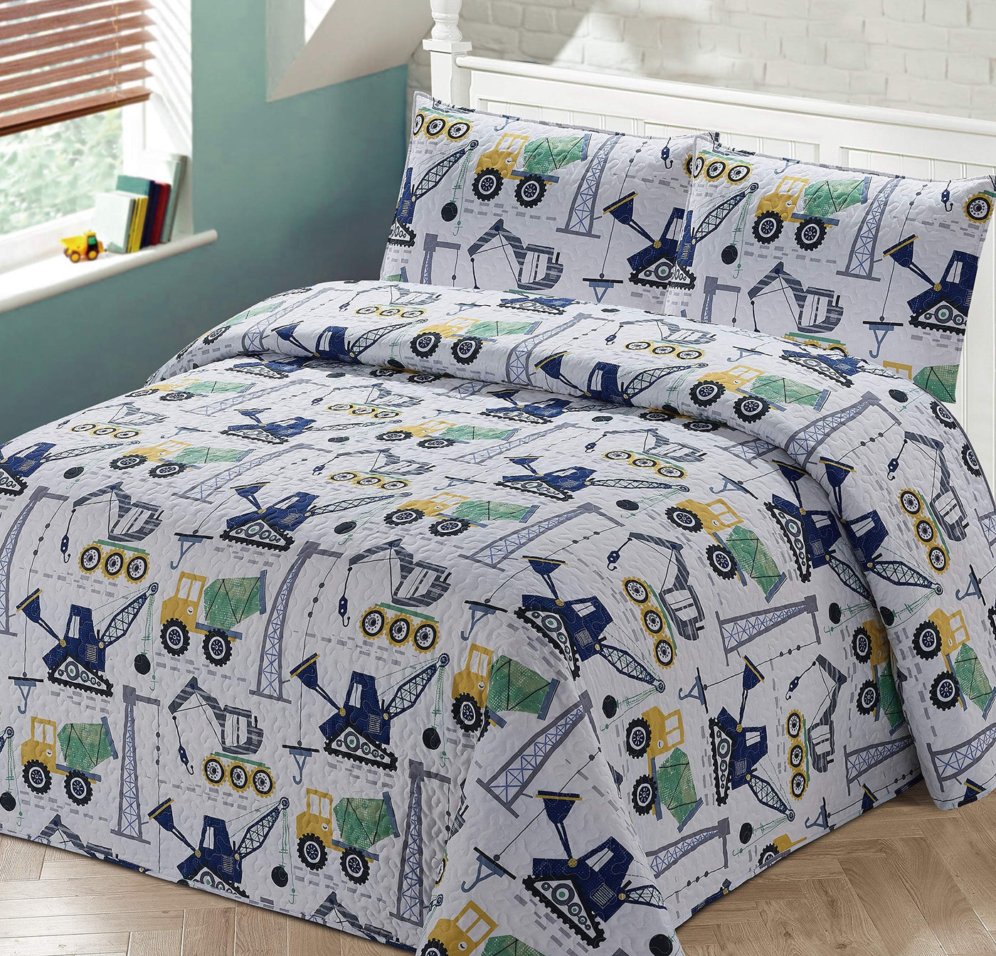 2Pc Twin Bedspread Coverlet Quilt Set Kids/Teens Boys Construction Crane Trucks Cement Truck White Blue Green Black Grey New
