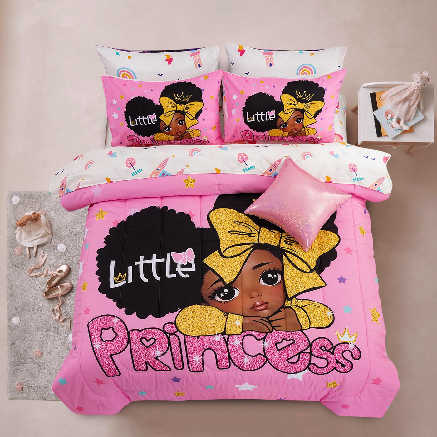 A Nice Night Black Girl Little Princess Comforter Set, Pink 6Pcs Bed In A Bag Twin Size Sparkling Stars Bedding Set,For Kids, Gi