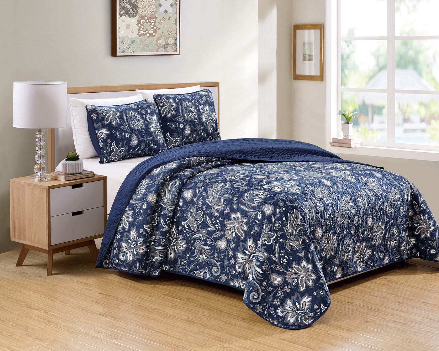 Kids Zone Home Linen Bedspread Set Floral Print Pattern Blue Taupe White Grey New (Twin/Twin Extra Long)