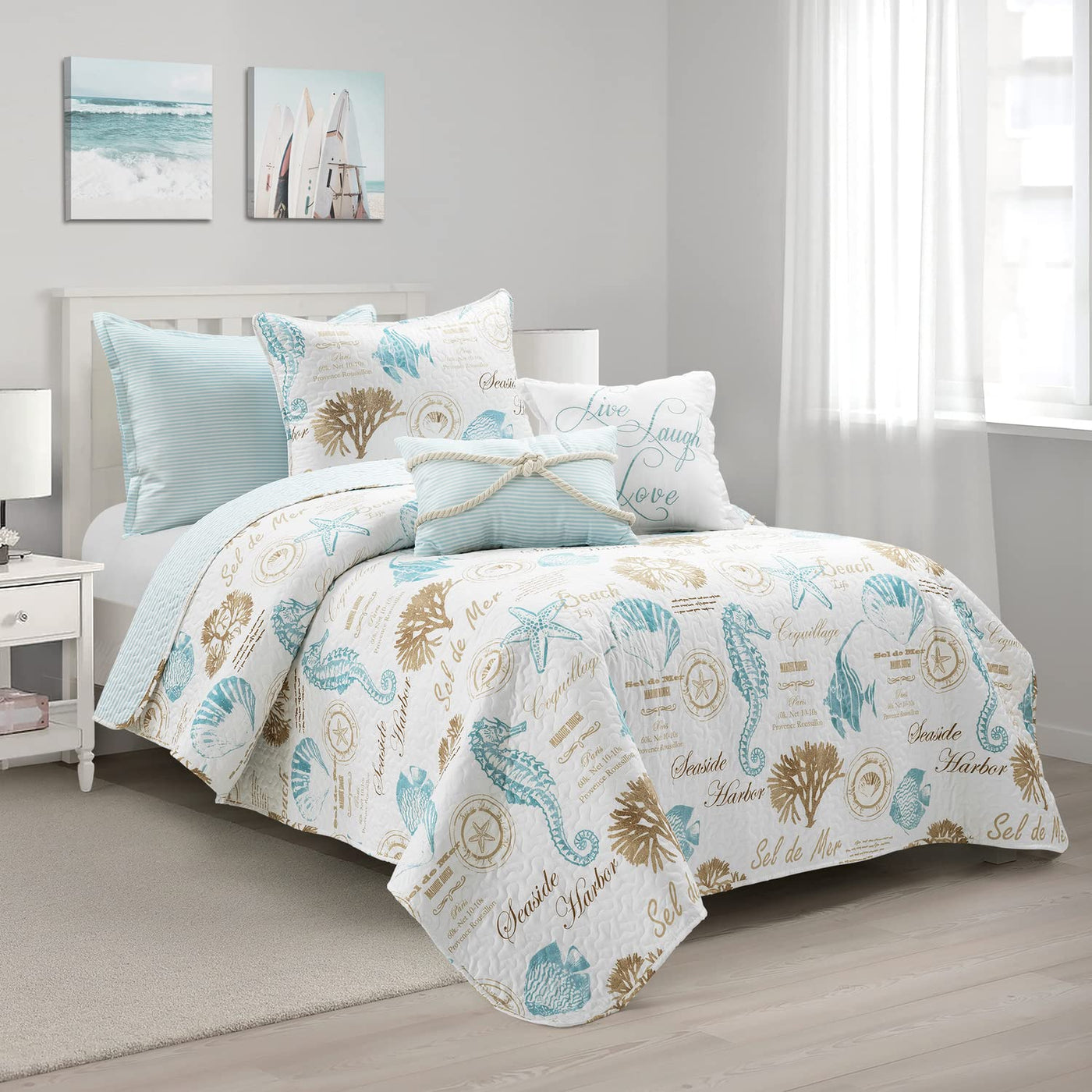 Transform Your Bedroom Into A Relaxing Seaside Retreat With Our Harbor Life Reversible Quilt Set. The Front Ocean Inspired Print Displays Various Types Of Sea Life Including Starfish, Seahorses, Fish, Coral Reefs, Sand Dollars, Seashells, And Beach Themed Wording. This Reversible Nautical Bedding Is The Perfect Beachy Accent To Add To Your Coastal Themed Primary, Guest Bedroom Or Dorm Room. Switch Up Your Decor By Simply Flipping This Quilt Set Over To Reveal A Blue And White Striped Pattern. Crafted From Microfiber, This Beach Themed, Coastal Bedding Set Offers Softness And Breathability. Any Beach Lover Would Love This Reversible Quilt Set For Their Own Bedroom. The Look Of This Set Is Also A Great Option For A Guest Bedroom. Your Guests Will Truly Feel They Are On A Vacation With This Theme. Crafted From Microfiber, This Beach Themed, Coastal Bedding Set Offers Softness And Breathability. The Polyfill Is Perfect For Hot Sleepers And Great As An Extra Layer For Those Cold Sleepers Who Layer-Up To Keep Warm. This 5 Piece Bedding Set Includes 1 Reversible Quilt, 1 Pillow Sham, 1 Pillow Case, And 2 Unique Decorative Throw Pillows. You Have A Fully Styled Bed Right Out Of The Bag. It'S Easy To Care For This Quilt Set, Simply Machine Wash Cold On A Gentle Cycle And Tumble Dry Low. If Needed Use Non-Chlorine Bleach For Cleaning And A Steamer To Release Wrinkles. Spot Clean The Throw Pillows. Please Be Sure To Follow All Instructions On The Label.