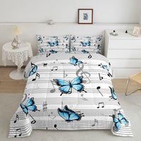 Music Kids Comforter Set Queen Size,Music Note Piano Musical Bedding Set,Boys Girls Adults Room Decor,Blue Butterfly Rustic Coun