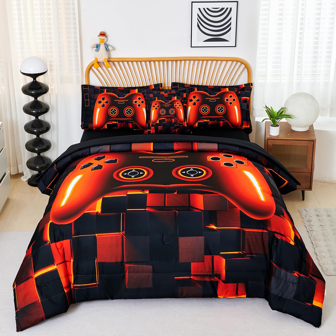 Perfemet 6 Piece Orange Gaming Bedding Set Twin Size Game Console Boys Comforter Set With Sheets 3D Cool Soft Fluffy Video Gamer