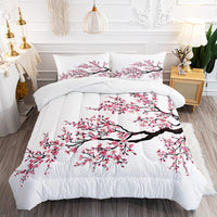 Romantic Asian Cherry Blossom Sakura Flower Branches Comforter Set For Girls Kids Teens, Queen Size Eastern Red Petal Floral Art