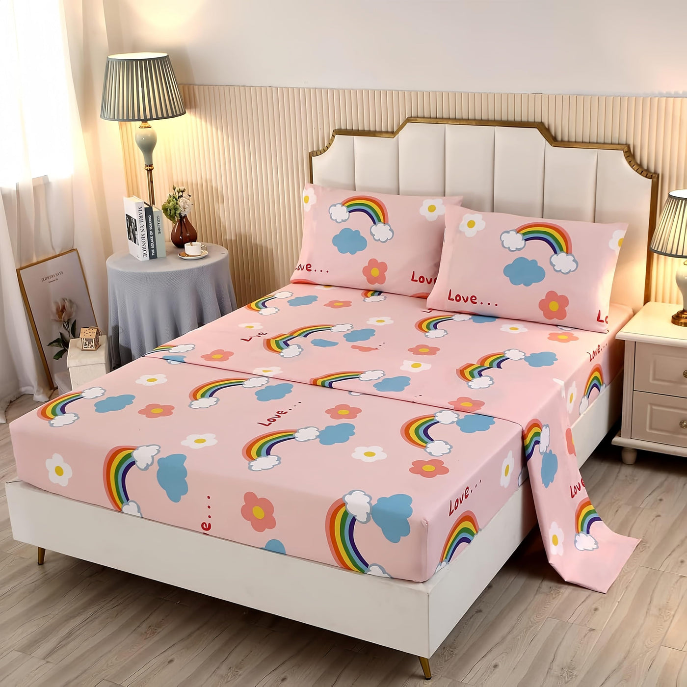 Sdy 4Pcs Mermaid Sheets Twin,Floral Rainbow Twin Size Cute Sheets Set Included 1 Deep Pocket Fitted Sheet+1 Top Flat Sheet+2 Pil