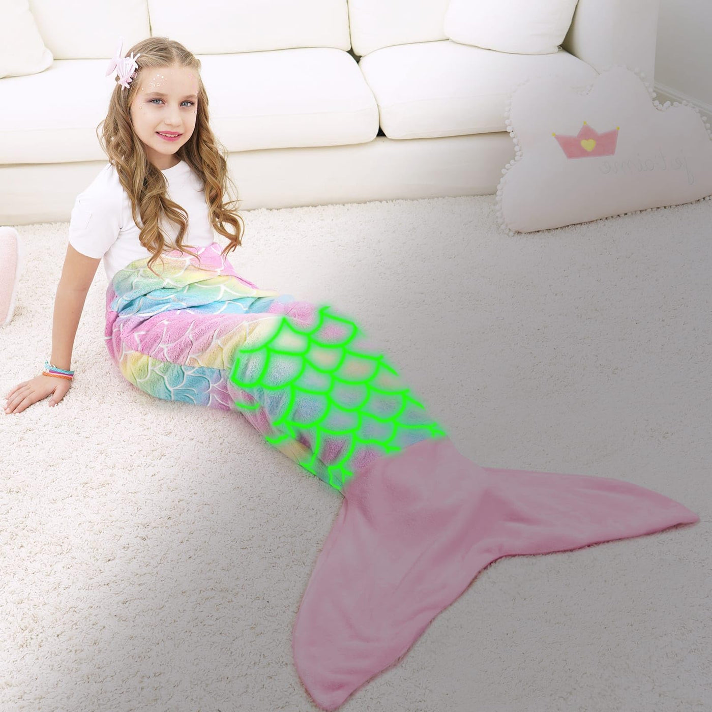 WERNNSAI Mermaid Tail Blanket - Glow in The Dark Mermaid Wearable Blanket for Girls 43.3 x15.7 Kids Winter Soft Flannel Scale