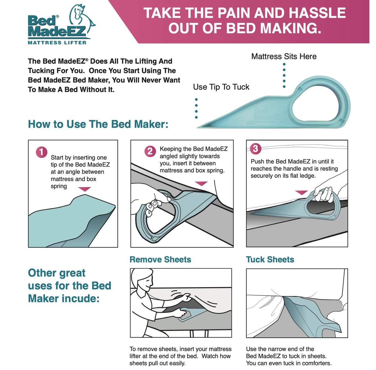Making A Bed Just Got Easy, With The Bed Madeez Bed Making Kit. Each Inclined Wedge Lifts The Mattress From The Box Spring 4-5 Inches As It Slides In. These Tools Reduce Body Strain That Occurs With The Twist And Lift Motion Of Conventional Mattress Lifting. The Curved Handle On Each Tool Allows You To Grip It At A Natural Wrist Position, Which Provides Comfort, Strength And The Transfer Of Energy. With The Mattress Raised In An Elevated Position, You Have Both Hands Free To Make The Bed Or Apply Or Remove Bed Skirts. Patented And Made In The Usa. Lifetime Replacement Warranty. Also, Use The Bed Madeez To Tuck In Your Linens Or Smooth The Sheets.