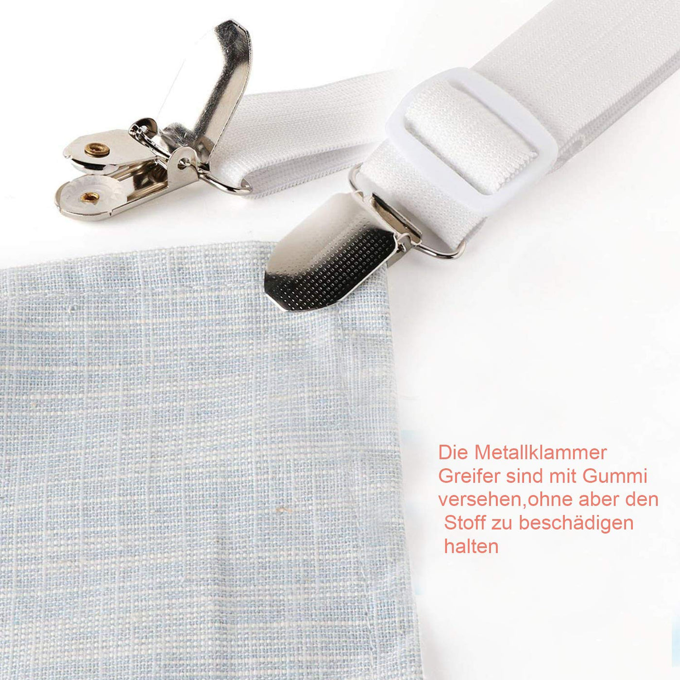 '1. Packing List: ' 8 * Bed Sheet Straps 2.Produktdetails: Material: High Quality Metal Rubber Band / Plastic Color: White Bandwidth: 25Mm Length: Adjusts From 20 ~ 50 Cm ? The Newest And Hottest Product Being Used For Keeping Sheets Tight All Night Long! Make Your Life Easier. ? Fit For Bed Sheets, Mattress Pads, Tablecloths, Ironing Board Covers, Slipcovers And More ? With Integrated Plastic Clasp System That Protects The Fabric From Damage. ? Easy To Install And Keep Each Bed Sheet In Place. The Length Is Adjustable For The Desired Tension.