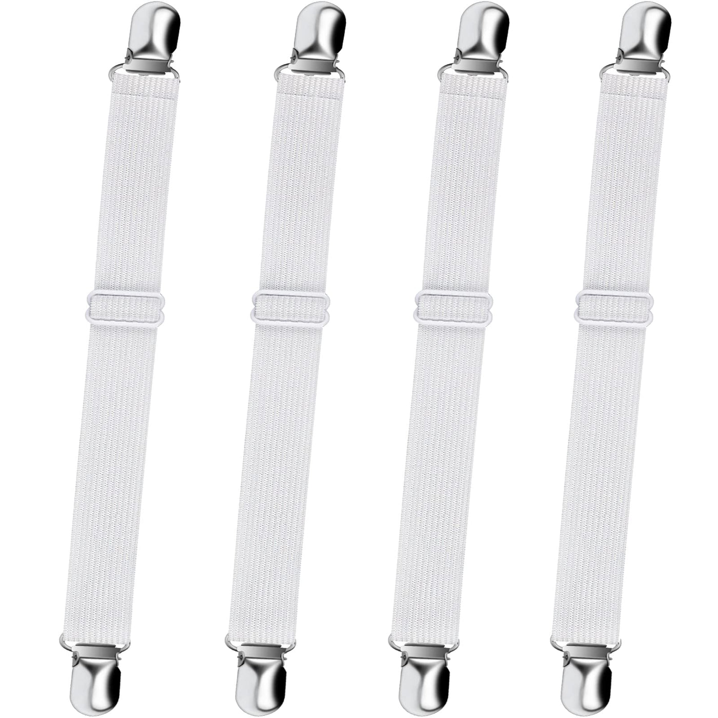 Sopito Premium Adjustable Bed Sheet Fasteners Widely Used To Help Secure Flat Or Fitted Bed Sheets, Other Bed Covers Like Mattress Pads Hospital Bed, Sofa Cushion, Mattress Pads, Tablecloth Covers, Chair Boat Car Motorcycle Seat Covers, Ironing Board Covers Mattress Pads, Tablecloths, Slipcovers, Etc Very Practical And Useful For Daily Use Product Features ---Heavy Duty ---Durable & Sturdy ---Adjustable & Elastic Product Details Color: White Max Stretch Size: 268Inch Adjusted Size: 63Inch) To 12Inch Materials: Quality Polyester Bungee Band+ Plastic Buckle+Stronger Metal Clips Pacakge Includes 4Pcs X Bed Sheet Fasteners