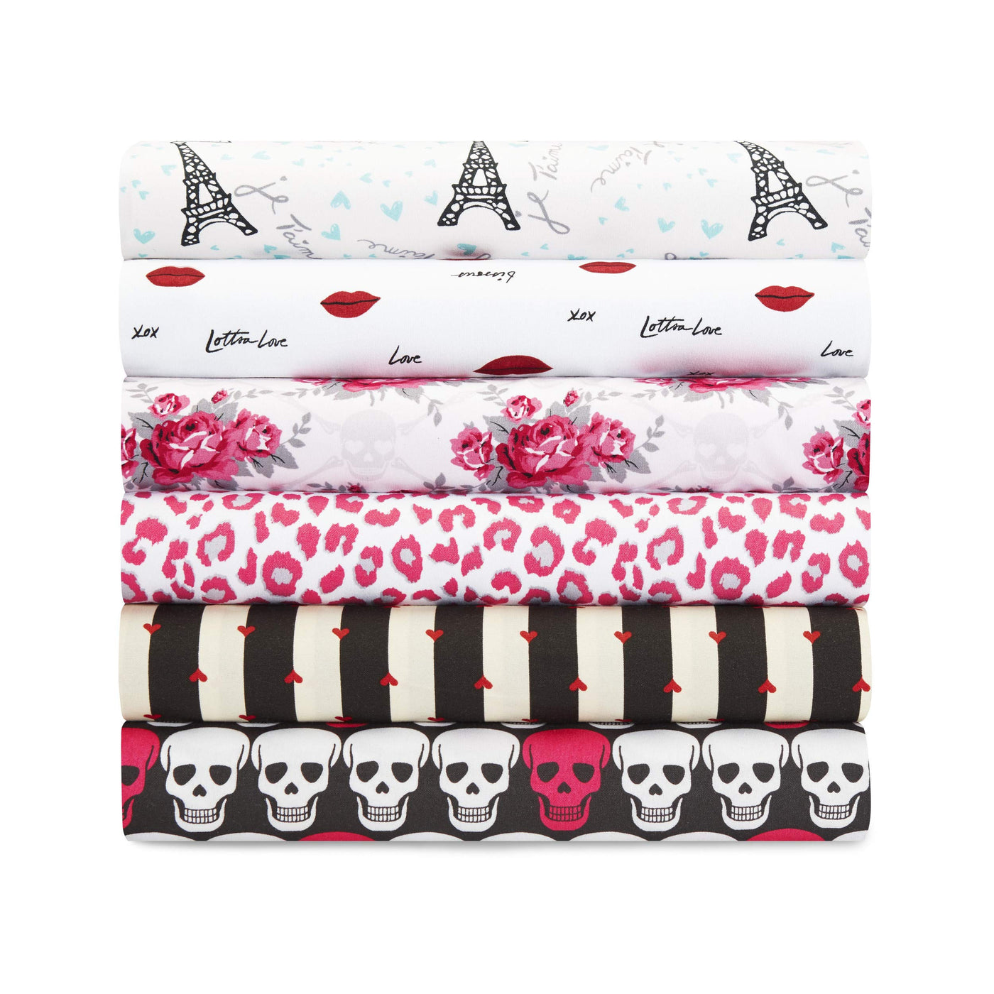 Liven your bedroom up with a new printed Betsey Johnson microfiber sheet set. Constructed of the softest lightweight microfiber, these sheet sets are fade, stain, and wrinkle resistant, in addition to extremely comfortable. The whimsical patterns are the perfect combination of color and fun, staying true to Betsey Johnson's vision. The sheet sets are available in a variety of patterns from betsey's signature skulls, leopard prints and detailed florals, to fun text and classic stripes. Love betsey's style? pair these super soft sheet sets with a new Betsey Johnson comforter set. The twin and twin xl sets include one fitted sheet, one flat sheet and one standard pillowcase; the full and queen sets include one fitted sheet, one flat sheet two standard pillowcases; the king set includes one fitted sheet, one flat sheet and two king pillowcases. Included fitted sheet features a 15' deep pocket (12' for twin sizes) to help the sheet stays in place. For easy care, all sets are machine washable.