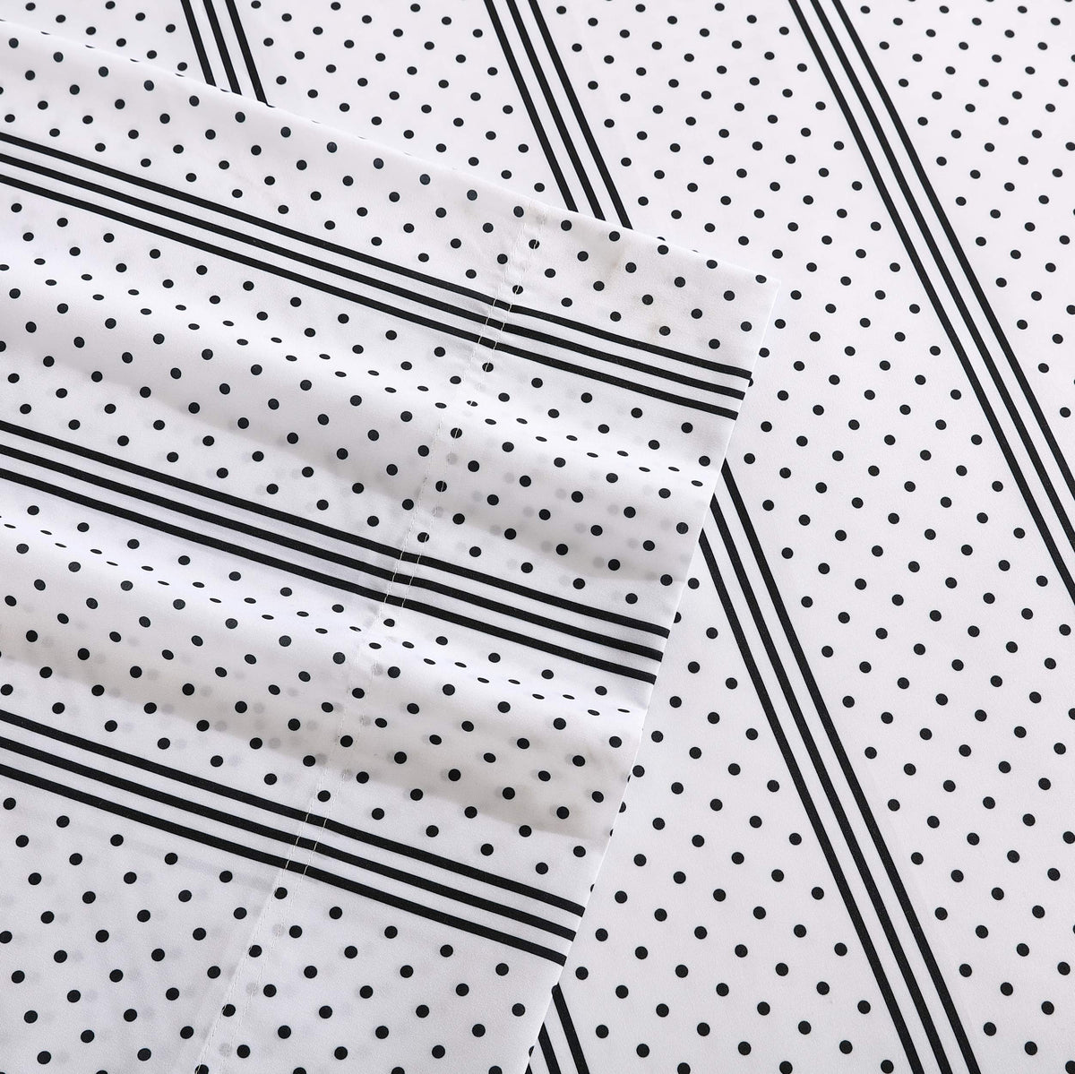 Bring some fun patterning into your bedroom with the Dots And Stripes Sheet Set from Betsey Johnson. With its bold black and white design that combines playful dots with striping, this stylish microfiber sheet set features a smooth and super soft feel with wrinkle-free properties perfect for everyday use. Included fully elasticized fitted sheet prevents slipping from your mattress and ensures a perfect fit. Set is machine washable for easy care.