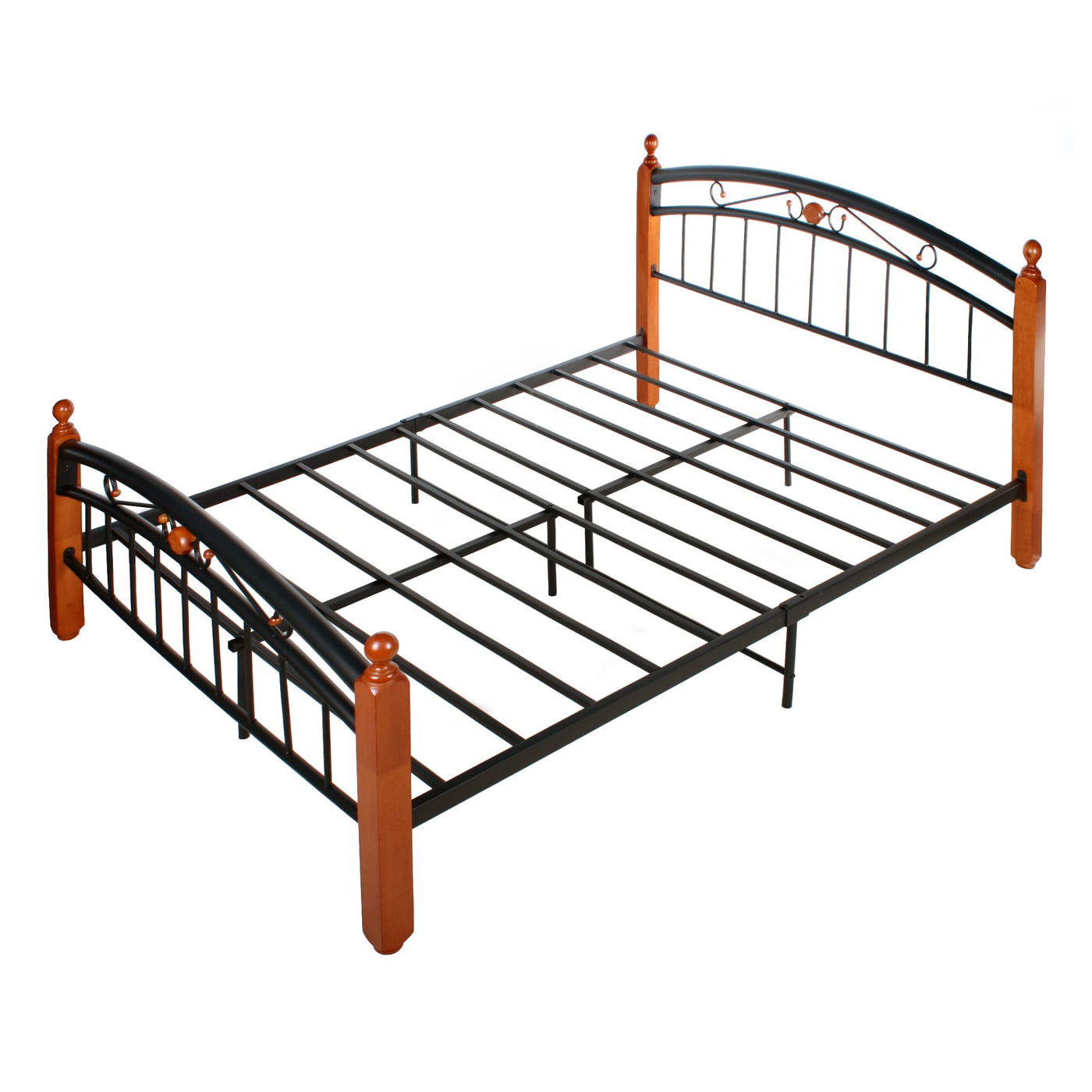 - Premium powder coated black steel frame bed with headboard and footboard in queen size. - Complete with contrast wooden legs in cherry finish, this industrial style metal frame lets you sleep well and look great doing it. - No box spring needed. With 10 legs and 12 metal slats Lexus provides support and stability for you and your mattress night after night. - With 11 of clearance underneath, youll have plenty of room to store your odds and ends. - Overall Dimensions: 85 L x 62 W x 41 H. Maximum weight capacity is 500 lbs. - Quick and easy assembly. All parts, tools and instructions are shipped straight to your door for simple set-up that takes under 45 minutes..