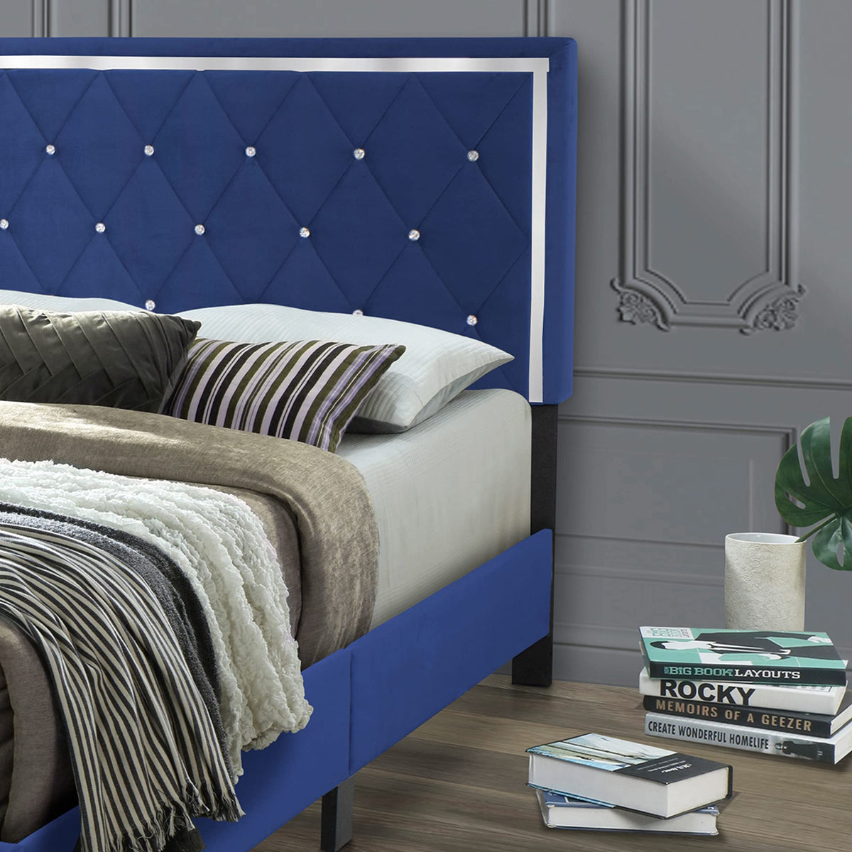 Your bedroom is only a click away to that page-out-of-a-magazine look with the bold and modern design of Better Home Products Monica Velvet Upholstered King Platform Bed. The headboard, with its sophisticated stitching, mirror details and crystal tufting, rises more than 2 feet over the top of the bed frame to create a focal point in your bedroom. Soft and gorgeous velvet upholstery, sturdy wood legs, and a durable wooden frame offers stronger, all-in-one support for your mattress that looks beautiful in any setting. Available in Black, Blue and Gray color options. Assembly required.