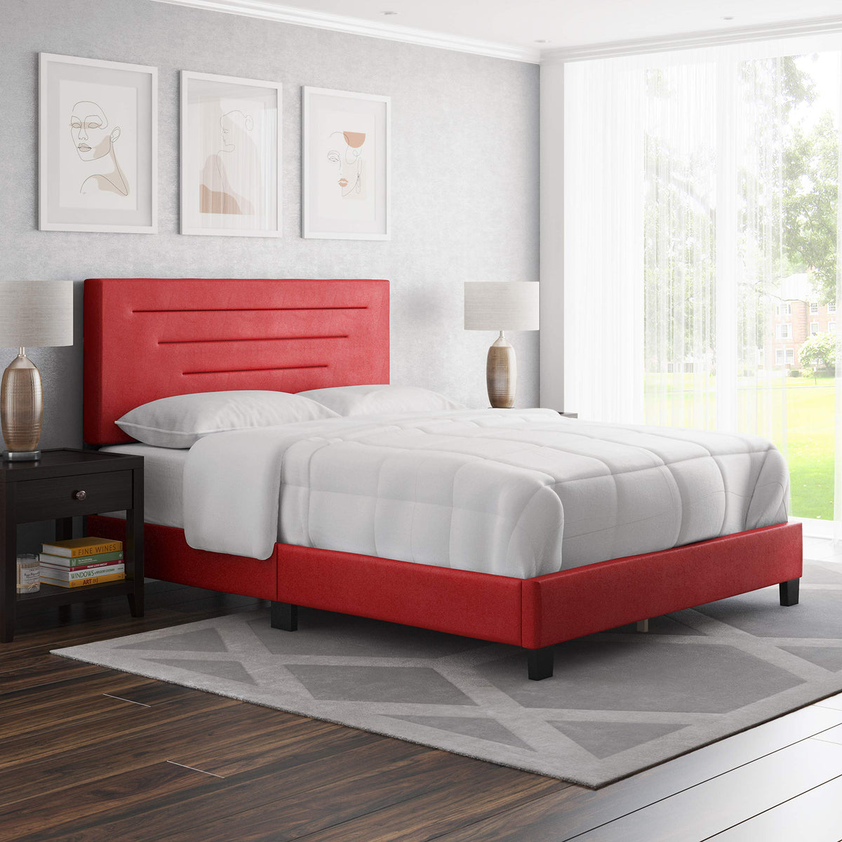 Style your bedroom with the Luxembourg Faux Leather Platform Bed. This contemporary upholstered platform bed features graduated stitching detail with an architecturally inspired design. Available in two color options, Red or Blue, making it a brilliant focal point of any room. Quick, simple and easily assembled in minutes, the Luxembourg is an easy way to add modern style to any master bedroom or guest room.