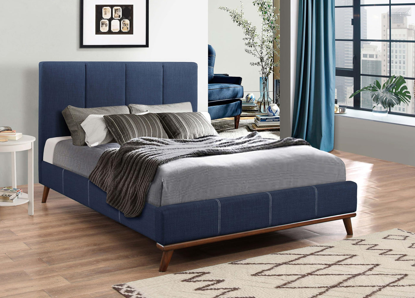 The Charity collection presents this attractive bed with a smooth silhouette. It features a high headboard and low-profile footboard with a paneled design. The bed is wrapped in a blue upholstery for added distinction. The angled legs add a modern, assertive touch to smooth, clean lines. This bed is sure to be the showpiece feature of any bedroom decor.