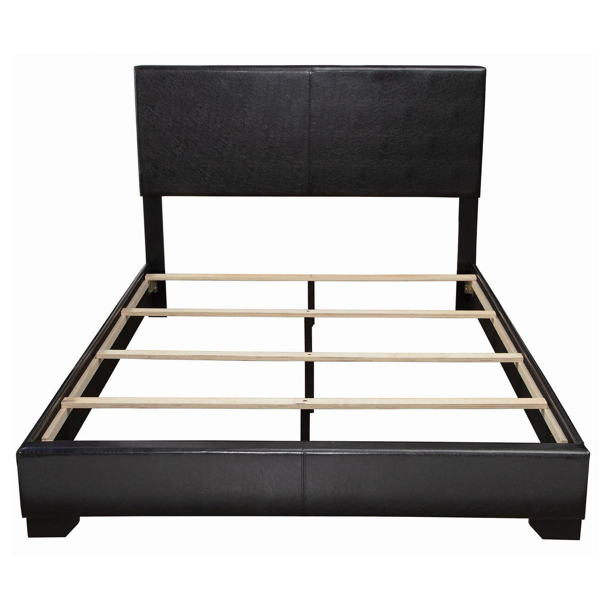 This Coaster Conner Transitional Black Upholstered Bed with Low Profile, Full measures 57" Length x 80" Width x 47" Height. This sleek, upholstered full bed in dark black will bring a smooth and effortless look to your bedroom. The bed is upholstered in black faux leather with solid wood legs, also finished in black. The faux leather upholstery covers both the rectangular headboard and thick sideboard.