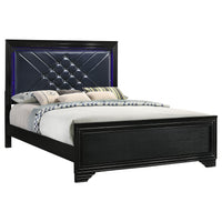 Every bedroom instantly becomes more alluring with this LED light-up bed. A faux leather argyle panel headboard is adorned with crystal-like tufting and lighting around the frame. Molding accents surround the frame and a deep black with midnight star finish makes this panel bed an eye-popping display. The single panel footboard is enveloped in a molded frame for stylish appeal. This piece is supported on bracket style feet and made from quality Asian hardwood.FeaturesContemporary glam design with argyle pattern and an upholstered headboard Acrylic bling knobs compliment the midnight star leatherette upholstery that is easy to maintain Headboard feature blue LED touch lighting for ambiance Exclusive to CoasterDimensions:BedAssembled Product: 78.5 inches wide x 85 inches deep x 62.75 inches high Weight Capacity: 600 poundsAt Coaster, we are your premier source for exquisite furniture, offering diverse styles to enhance every aspect of your life. Our passion for excellence drives us to innovate, crafting budget-friendly furniture that complements your lifestyle. Explore our brands for endless design inspiration and make your living experience exceptional with thoughtfully designed, affordable pieces that inspire a life well-lived.