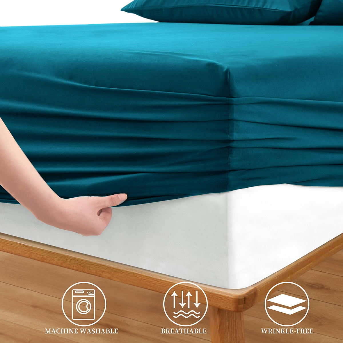 Horbaunal Extra Deep Pocket King Fitted Sheet Only - Fits Up To 24 Inch Mattress - Luxury 1800 Thread Count - Microfiber Teal Fitted Bed Sheet King Size About Horbaunal: Horbaunal, A Home Textile Brand, Aims To Produce And Sale Premium Quality Bedding And Textile Product At A Affordable Price. Our Mission Is To Help Our Customers Have A Wonderful Sleeping Experience And Create A Warm Home. Feature: Super Soft - Made Of High Quality 1800 Thread Count Microfiber, Soft And Breathable, Anti Pilling, Fade And Wrinkle Resistant. Perfect Fit - Design For A Snug Fit, 21 Inch Deep Pocket And Elastic Band Around The Fitted Sheet Can Hold Your Mattress Firmly. Easy Care - Machine Washable In Cold Water And Tumble Dry Low. The Sheet Set Will Be Smoother And More Comfortable If You Dry It Flat. Design - Storage Pocket On The Side Makes It Storage Easily Small Objects. Pure Color Bed Sheet Set Blends Easily With Any Decor, Everthing Is Just Right. Specification: Material: Microfiber Color: Teal Package Content: 1 X Fitted Sheet King Size Size For Your Choice: Twin - 75'' X 40'' + 21'' Full - 75'' X 54'' + 21'' Queen - 80'' X 60'' + 21'' King - 80'' X 78'' + 21'' Cal King - 84'' X 72'' + 21'' Your Satisfaction Is Our Primary Goal. We Are Devoted To Produce High Quality Bedding Set For Great Sleeping. Don'T Hesitate, Just Try Our Product And You Will Fall In Love It.