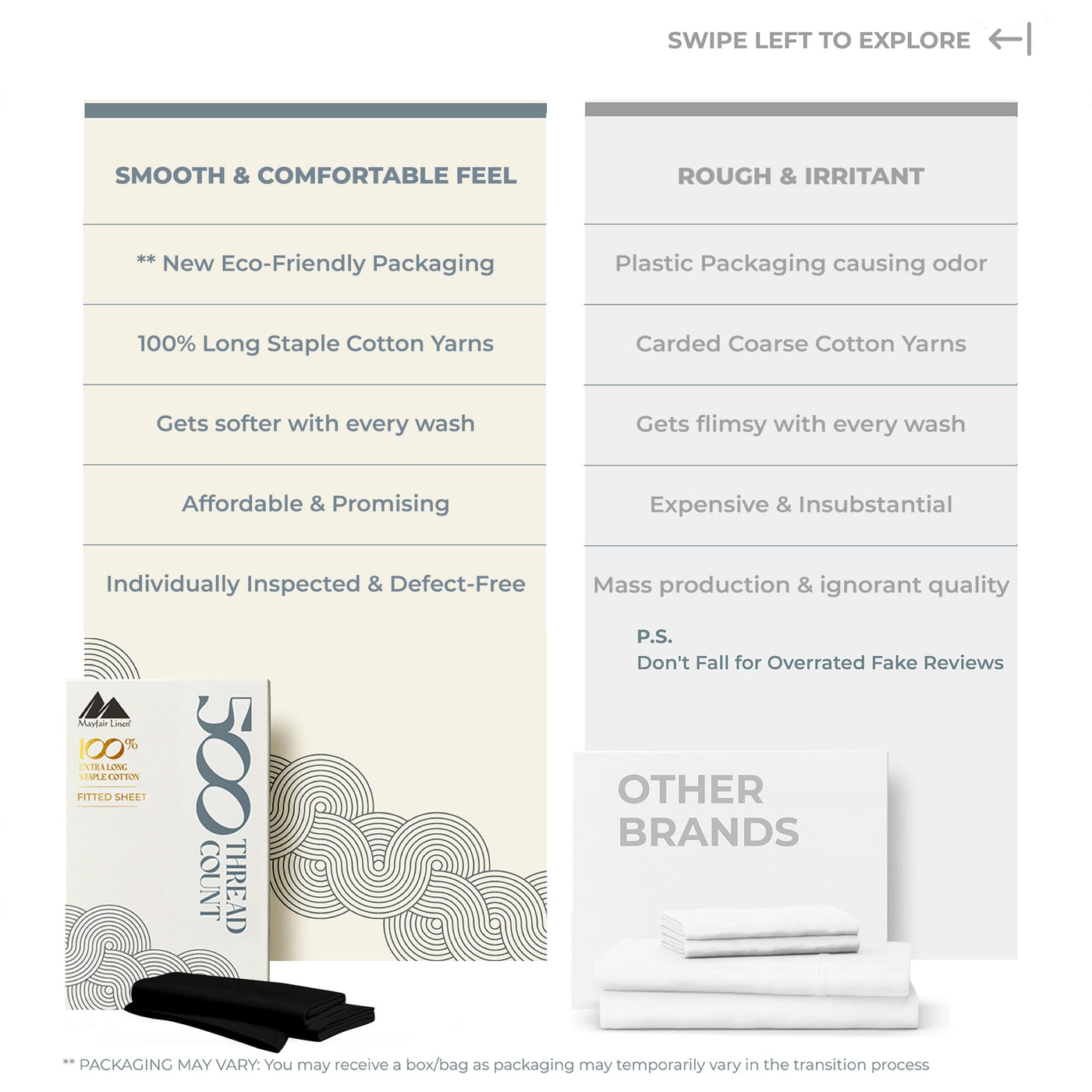 Q: What makes Mayfair Linen's fitted sheet different from microfiber sheets?A: Mayfair Linen's fitted sheet is made from 100% mercerized cotton with a 500 thread count, offering increased luster and durability compared to microfiber sheets, which can attract dust and may irritate the skin. Our cotton sheets are breathable and cool to the touch, providing a healthier sleep experience.