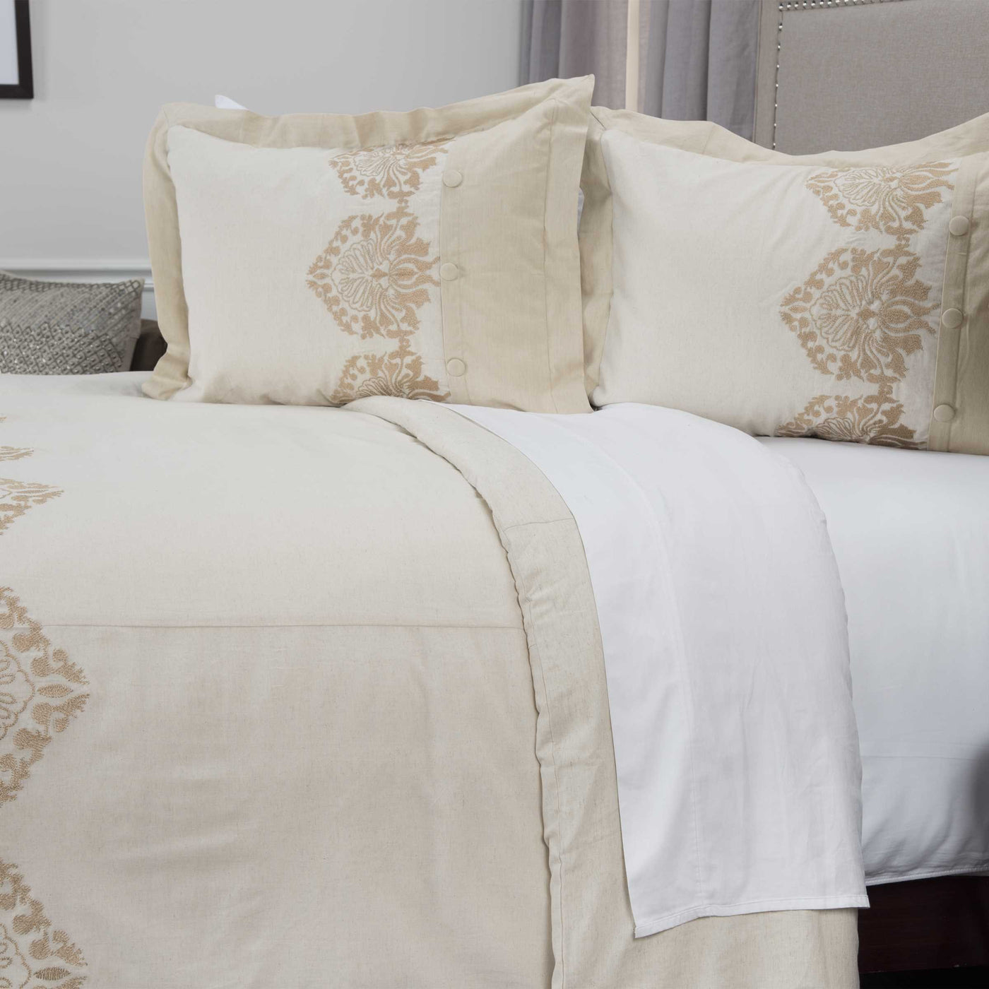 Clean lines, classically tailored with impeccably embroidered damask motifs, this flax/cotton blended duvet cover is classic and timeless. Covered button closure borders the metallic infused embroidered accents; those motifs are mirrored in a smaller scale on the shams. Sporting just a Glint of shimmer, alysa can be dressed up to great Gatsby bling or be a hint of flirt in a classically traditional decor. Four interior ties secure the duvet filler preventing bunching and shifting of the filler with use. Shams feature split backs for ease of filling. Look for coordinating styles! no