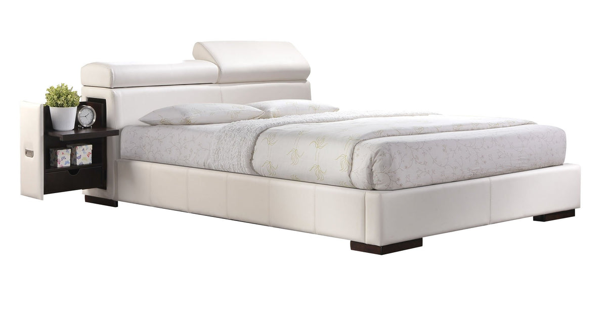 The Manjot Bed features white PU all over with build-in nightstand and adjustable headboard. Practical and stylist. This bed will be a great addition to your room environment.