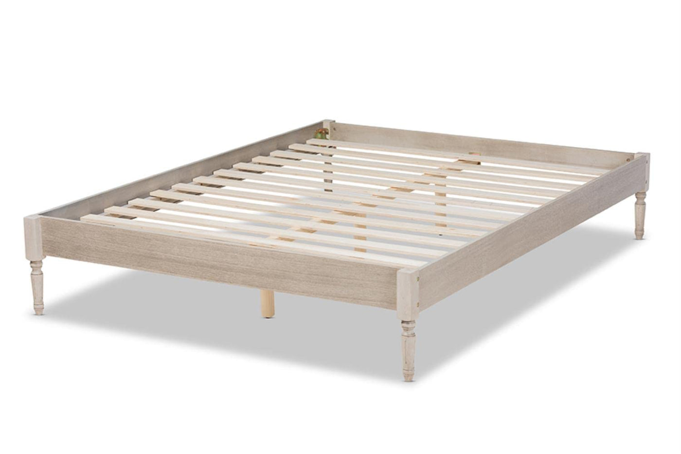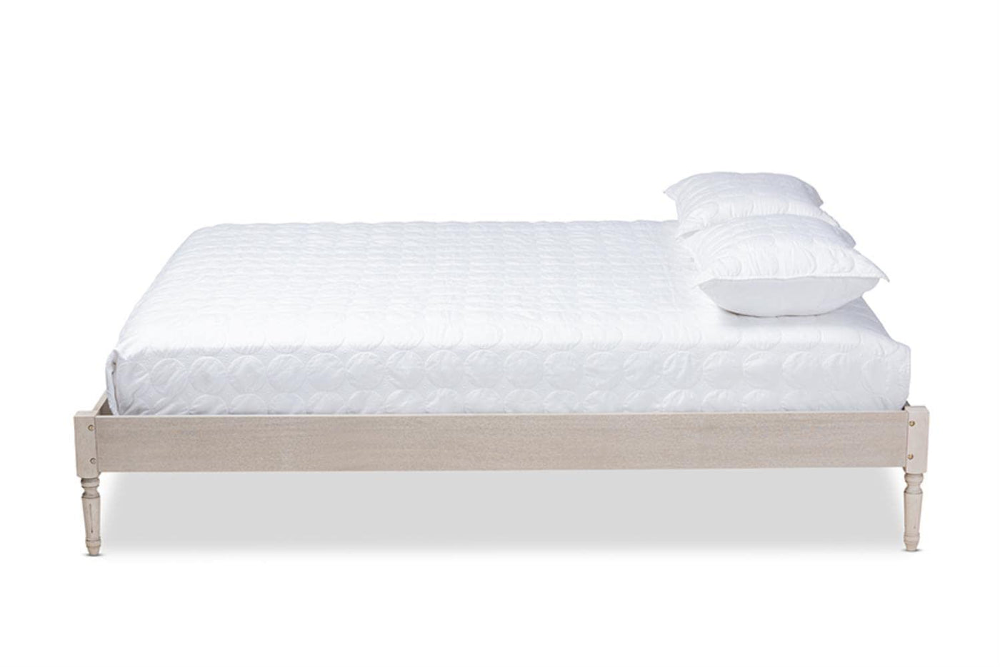 With its exquisitely carved legs, the Colette bed frame adds understated romance to any space. Crafted from wood, the Colette features an aged white oak finish for an antique look. Its low platform provides a casual feel, while fluted legs lend an old-world charm. Add some pillows and a plush duvet to create a cozy retreat. This bed includes wood slats, which eliminate the need for a box spring. The Colette bed frame is made in Malaysia and requires assembly.FeaturesFrench Bohemian platform bed frameConstructed from rubberwood, MDF wood, and LVLAntique white oak finishFluted legs Slats eliminate the need for a box springCare Instruction: Wipe CleanStyle: French ProvincialMaterial: Rubberwood/MDFColor: Antique WhiteIncludes: One (1) Queen Size Bed FrameDimensions: 14.92" high x 85.43" wide x 63.78" deep; Distance between slats: 3.48"; Height from floor to top of slat: 12.4" high; Legs: 14.92" high; Inside dimensions (mattress size): 60" wide x 80" deepAssembly Required: YesMade In Malaysia
