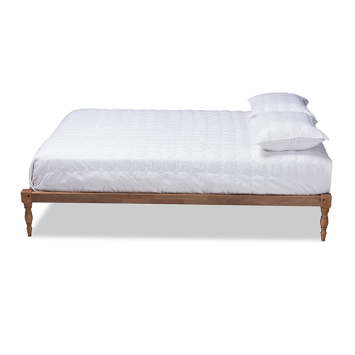 Keep your bed setup cool and casual with the Iseline bed frame. Crafted from solid rubberwood, the Iseline features a classic walnut brown finish that complements any color palette. Its low platform provides a modern feel, while turned legs lend an old-world charm. Add some crisp white sheets and plush duvet to create a cozy retreat. This bed includes wood slats, which eliminate the need for a box spring. The Iseline bed frame is made in Malaysia and requires assembly.Dimensions: 13" High x 57.1" Wide x 76.2" Deep; Slats: 2.5" Wide x 53.9" Long x 0.6" Thick; Top of Slat: 11.8" High; Legs: 10.3" High; Inside Dimensions (Mattress Size): 54" Wide x 74" Deep