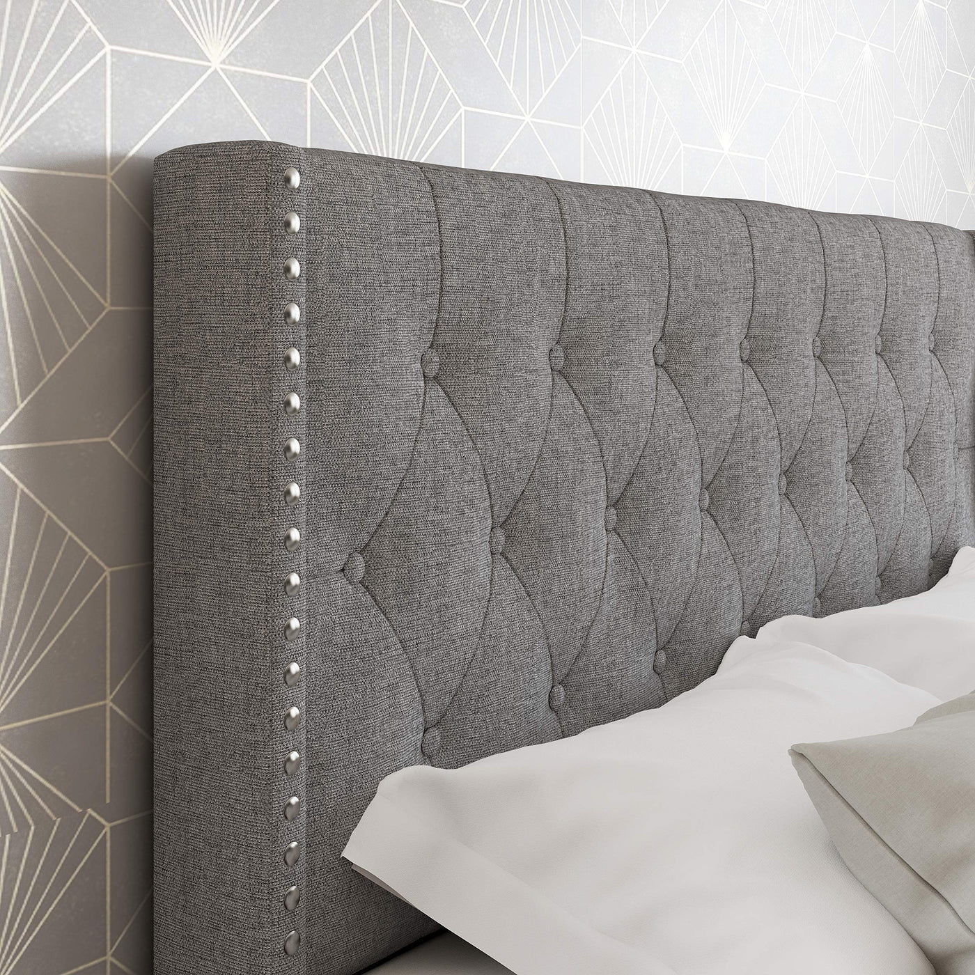 Boyd Sleep Mia Upholstered Button Tufted Platform Bed Frame Mattress Foundation With Headboard And Strong Wood Slat Supports: Linen, Grey, Queen