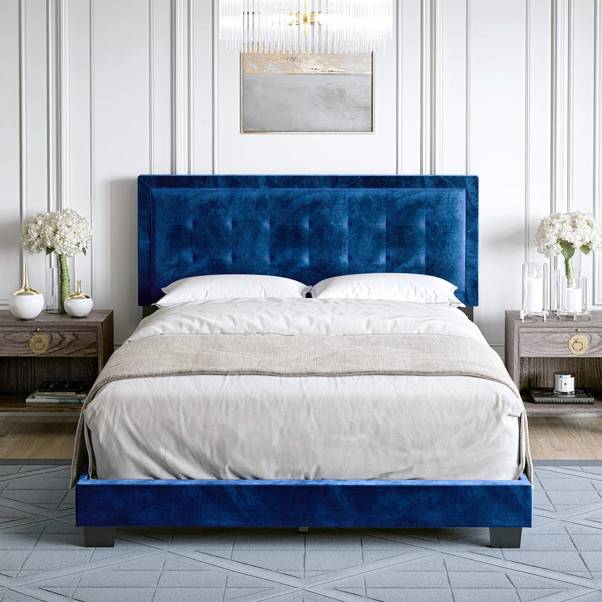 Boyd Sleep Pisa Upholstered Button Tufted Platform Bed Frame Mattress Foundation With Headboard And Strong Wood Slat Supports: Velour, Blue, King (Psbu964Ek)