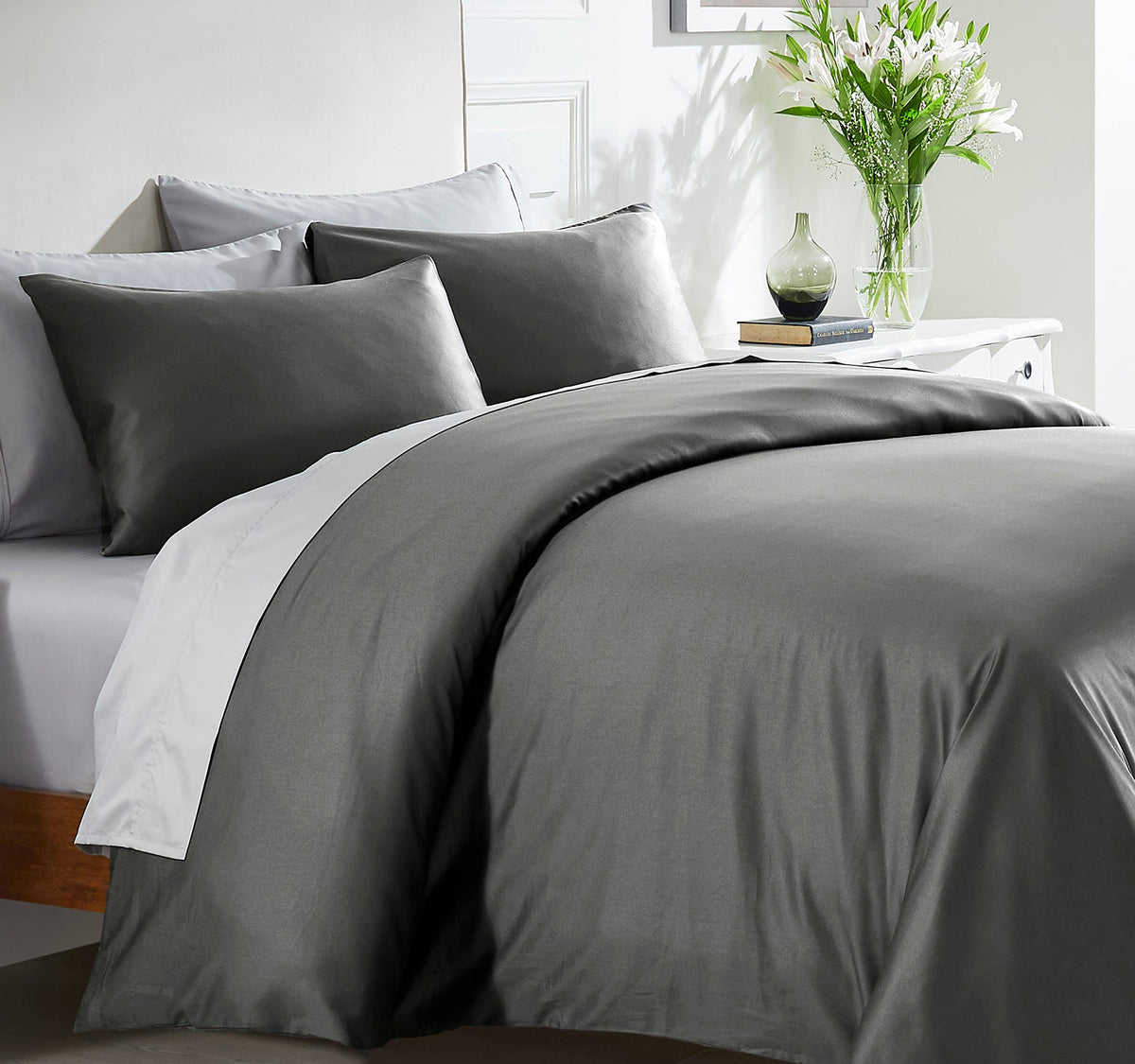 KEY HIGHLIGHTS - Authentic soft fabric made with 100% long staple cotton - Affordable premium range with 400 thread count - Easy button closure and internal ties to keep the duvet insert intact - Smooth sateen weave for a silky finish - Durable, cooling, and breathable 1 PIECE FULL/QUEEN SIZED DARK GRAY DUVET COVER Full/queen duvet cover sold separately: 92' W x 90' L Experience hotel luxury in the comfort of your home with ultra soft 100% cotton duvet covers. These supreme, sateen finish covers are carefully crafted for all-year around comfort. Whether you’re a hot sleeper or just looking to wrap yourself in some warmth, the temperature regulating cotton fabric has got you covered. The extra-fine, durable yarns are densely woven for less pilling, durable construction and superb breathability, comparable to that of Egyptian cotton. When crafting our natural cotton bedding, we only hand comb the cotton to filter out impurities. Then each piece is perfectly stitched by a skilled artisan. Give your room a makeover with high quality, machine washable bedcovers that only get softer over time. Our comforter covers are free from undesirable substances and we’re proud to use premium dyes from the world’s most renowned companies for lush, lasting color. Easy-to-fasten buttons and internal corner ties ensure that your comforter stays put. Say hello to trendy, designer bedding that feels incredible and stays perfectly in place. Feel like royalty as you climb into bed every night with luxurious, 400 thread count, pure cotton duvet covers.