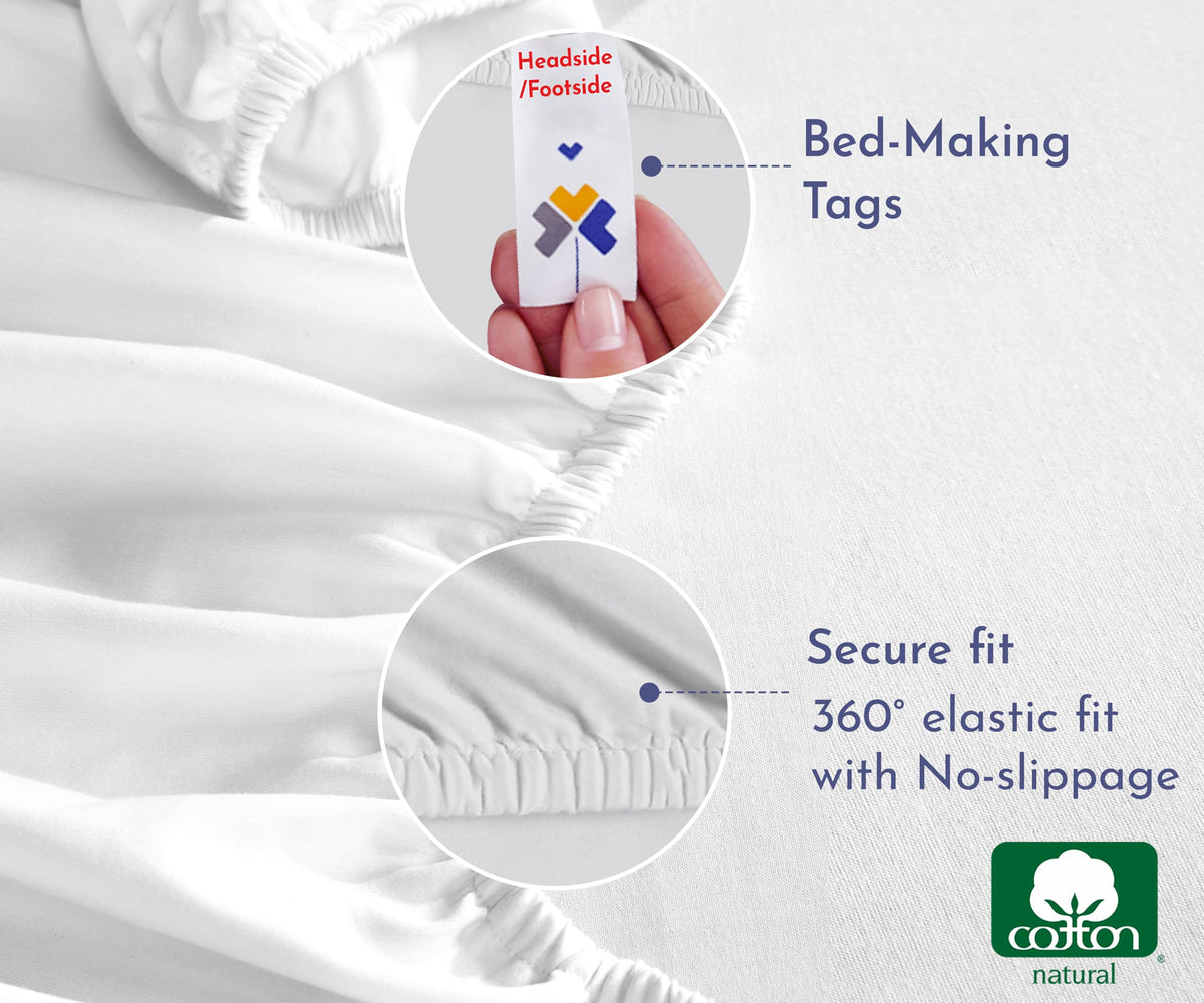 Our 100% cotton fitted sheet is designed to stay in place, provide comfortable sleep, and be an eco-conscious choice for your bedroom. The fitted sheet features all-around elastic for a snug, secure fit on your mattress, preventing slipping and sliding. It also has a head/foot side indicator for easy bed-making. Crafted by skilled artisans, our fitted sheet ensures high quality and attention to detail, from precise stitching to smooth cotton fabric. Made with 100% cotton, it is naturally soft and breathable, ensuring a comfortable sleep all night. Queen, Full, King, and California King fitted sheets fit mattresses up to 14 inches deep, while Twin and Twin XL fitted sheets fit mattresses up to 12 inches deep. Choose our cotton fitted sheet for a sustainable and comfortable bedding option.