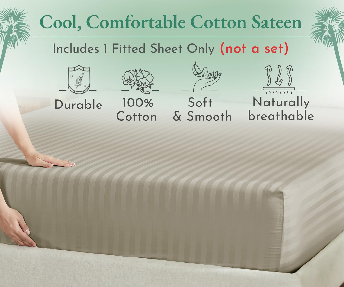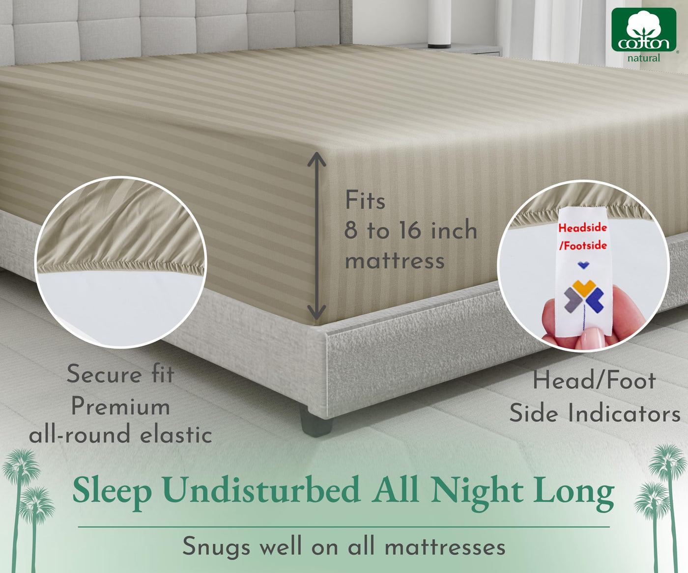 California Design Den Luxury Cotton Sateen Damask Stripe Full Fitted Sheet Only - Soft 100% Cotton Sateen, Deep Pocket Bottom Fitted Sheet, Hotel Quality With A Foot Side Indicator - Khaki
