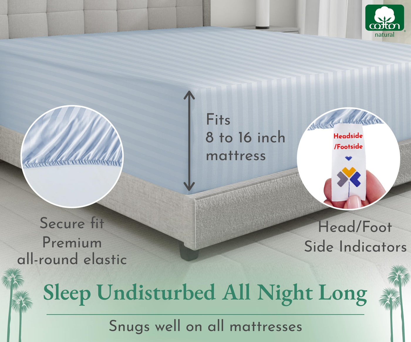 California Design Den Luxury Cotton Sateen Damask Stripe King Size Fitted Sheet Only - Soft 100% Cotton Sateen, Deep Pocket Bottom Fitted Sheet, Hotel Quality With A Foot Side Indicator - Light Blue