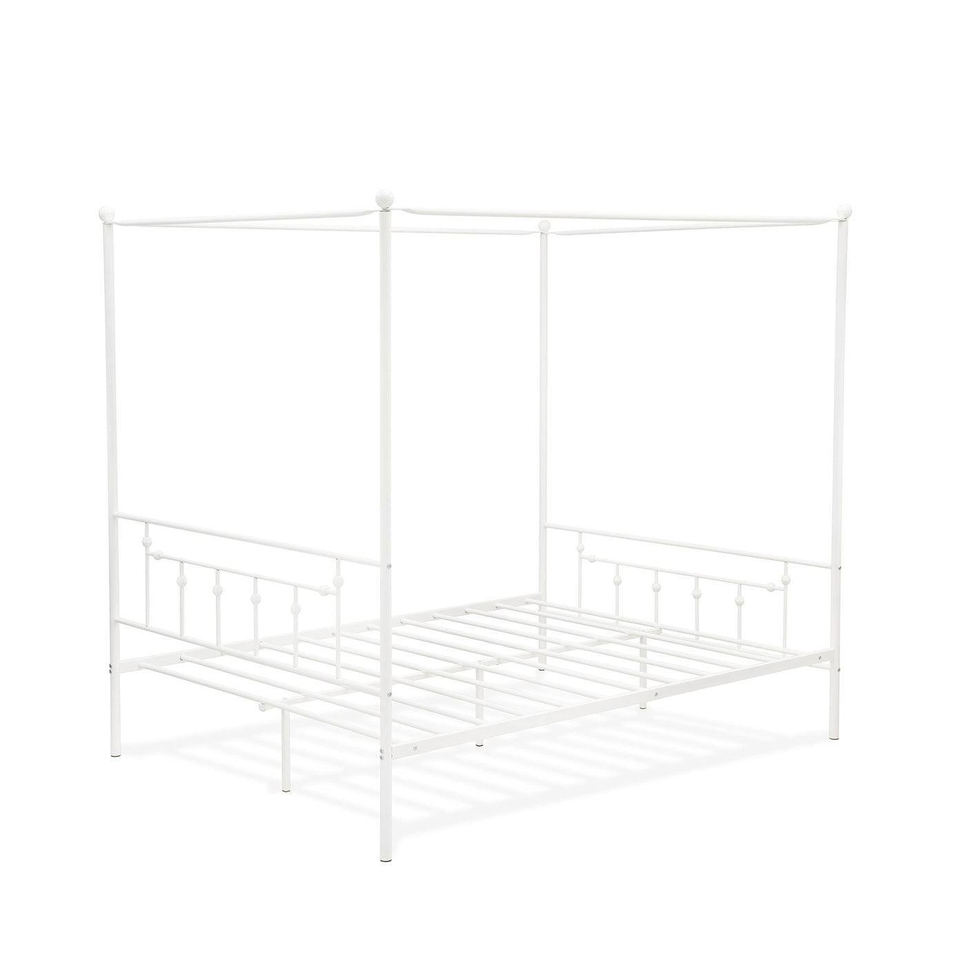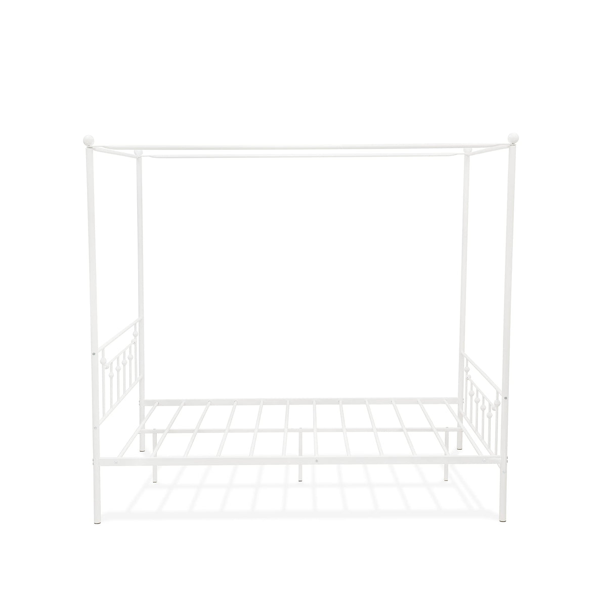 EAST WEST FURNITURE - ATQCWHI - QUEEN CANOPY BED FRAMEAdd a touch of luxury to your bedroom with this exquisite queen canopy bed frame. Constructed with a metal structure, this bed frame is designed for ultimate strength and safety, minimizing noise, vibration, and scratches. Its attractive finish adds elegance to any bedroom, and the powder-coated white color of the sturdy bed frame complements any interior decor. The classic modern design ensures maximum comfort, allowing you to relax more comfortably. Our queen bed frame is perfect for making any master bedroom look lavish and taking your sleep experience to a whole new level of comfort. You won't need a spring box with this bed frame, as it provides enough support with just a mattress. The package includes all the parts and tools required for assembly, and the instruction manual is easy to follow. Cleaning this queen size metal bed frame is hassle-free, as you can easily wipe it down with a damp cloth thanks to its smooth finish.PRODUCT FEATURES: Material: Metal Queen Frame Color: Powder Coating White Metal Frame Dimensions: Length: 82.3; Width: 62.3; Height: 77.Include in this Package: 1 Queen Size Bed Frame with Headboard and Footboard.NOTE: Mattress is not included in this Platform Bed Frame Set.