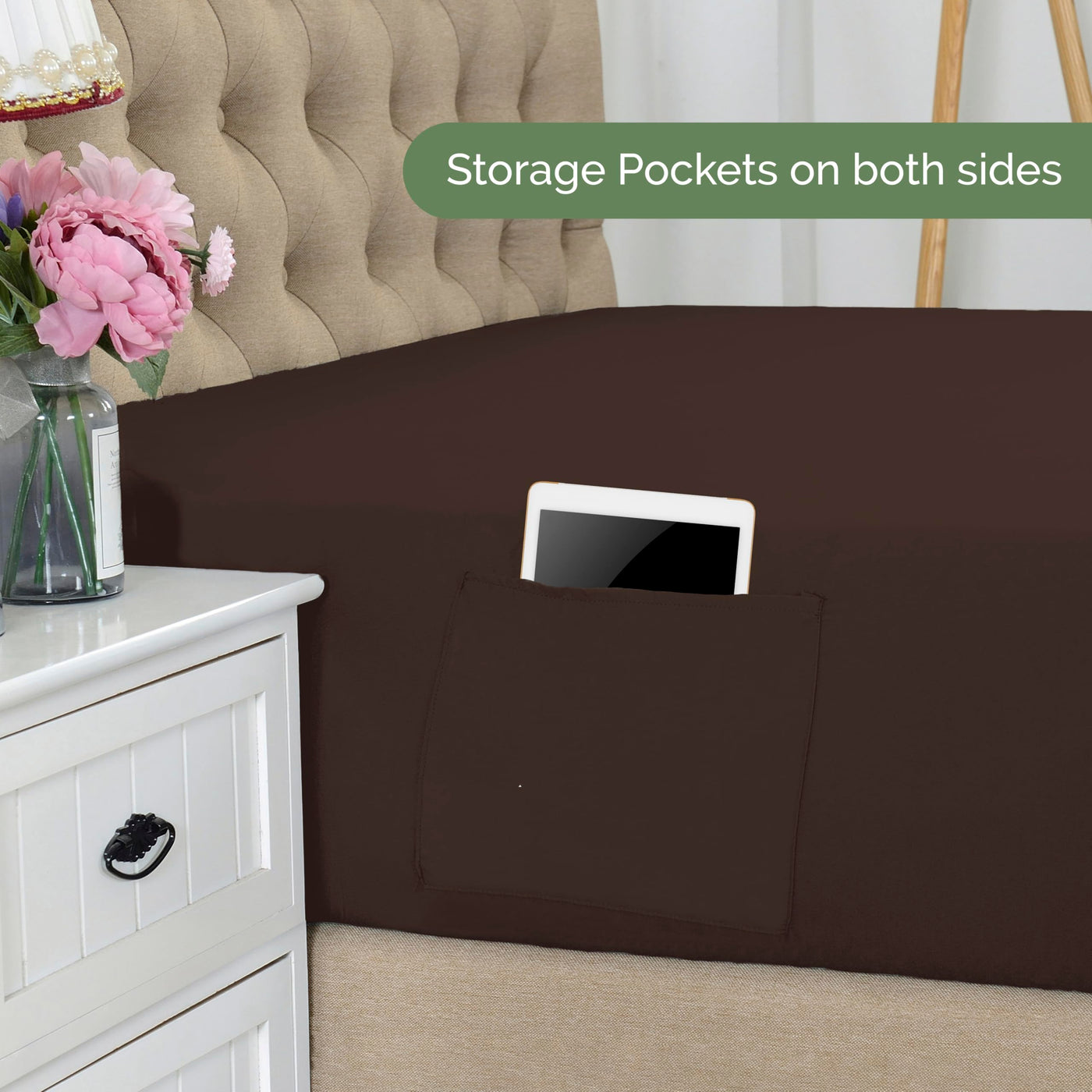 Upgrade your bedding with our Deep Pocket Fitted Sheet featuring Double-Sided Storage Pockets, designed for mattresses 18 to 21 inches deep. This premium fitted sheet is crafted from ultra-soft durable microfiber, providing a luxurious feel while offering a snug, secure fit that stays in place all night. The deep pockets easily accommodate thick mattresses, including pillow tops, memory foam and mattress toppers, ensuring a smooth and wrinkle-free surface. What sets this fitted sheet apart are the convenient double-sided storage pockets, perfectly positioned on both sides to keep your essentials within arm's reach. Store your phone, glasses, remote controls, books, or other nighttime necessities right beside you, eliminating the need for a bedside table. These pockets are designed to hold your items securely, offering easy access while you relax. The fabric is wrinkle-resistant, fade-resistant and machine washable, making it easy to care for while maintaining its fresh look and feel. Elevate your sleep experience with this practical and stylish fitted sheet, combining functionality with comfort.