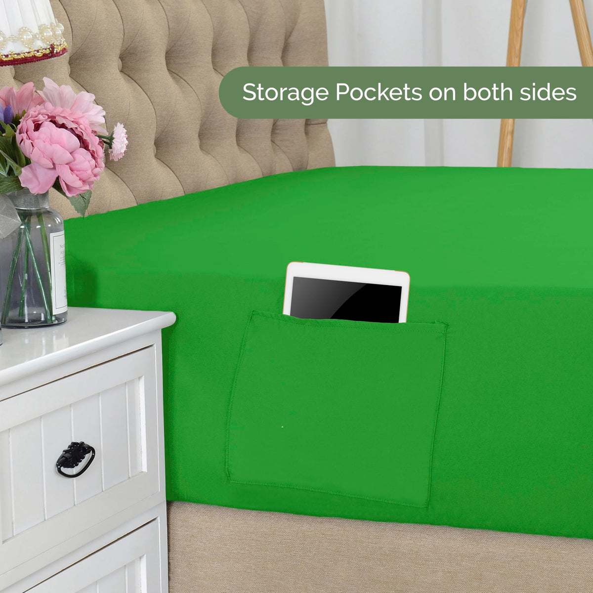 Upgrade your bedding with our Deep Pocket Fitted Sheet featuring Double-Sided Storage Pockets, designed for mattresses 18 to 21 inches deep. This premium fitted sheet is crafted from ultra-soft durable microfiber, providing a luxurious feel while offering a snug, secure fit that stays in place all night. The deep pockets easily accommodate thick mattresses, including pillow tops, memory foam and mattress toppers, ensuring a smooth and wrinkle-free surface. What sets this fitted sheet apart are the convenient double-sided storage pockets, perfectly positioned on both sides to keep your essentials within arm's reach. Store your phone, glasses, remote controls, books, or other nighttime necessities right beside you, eliminating the need for a bedside table. These pockets are designed to hold your items securely, offering easy access while you relax. The fabric is wrinkle-resistant, fade-resistant and machine washable, making it easy to care for while maintaining its fresh look and feel. Elevate your sleep experience with this practical and stylish fitted sheet, combining functionality with comfort.