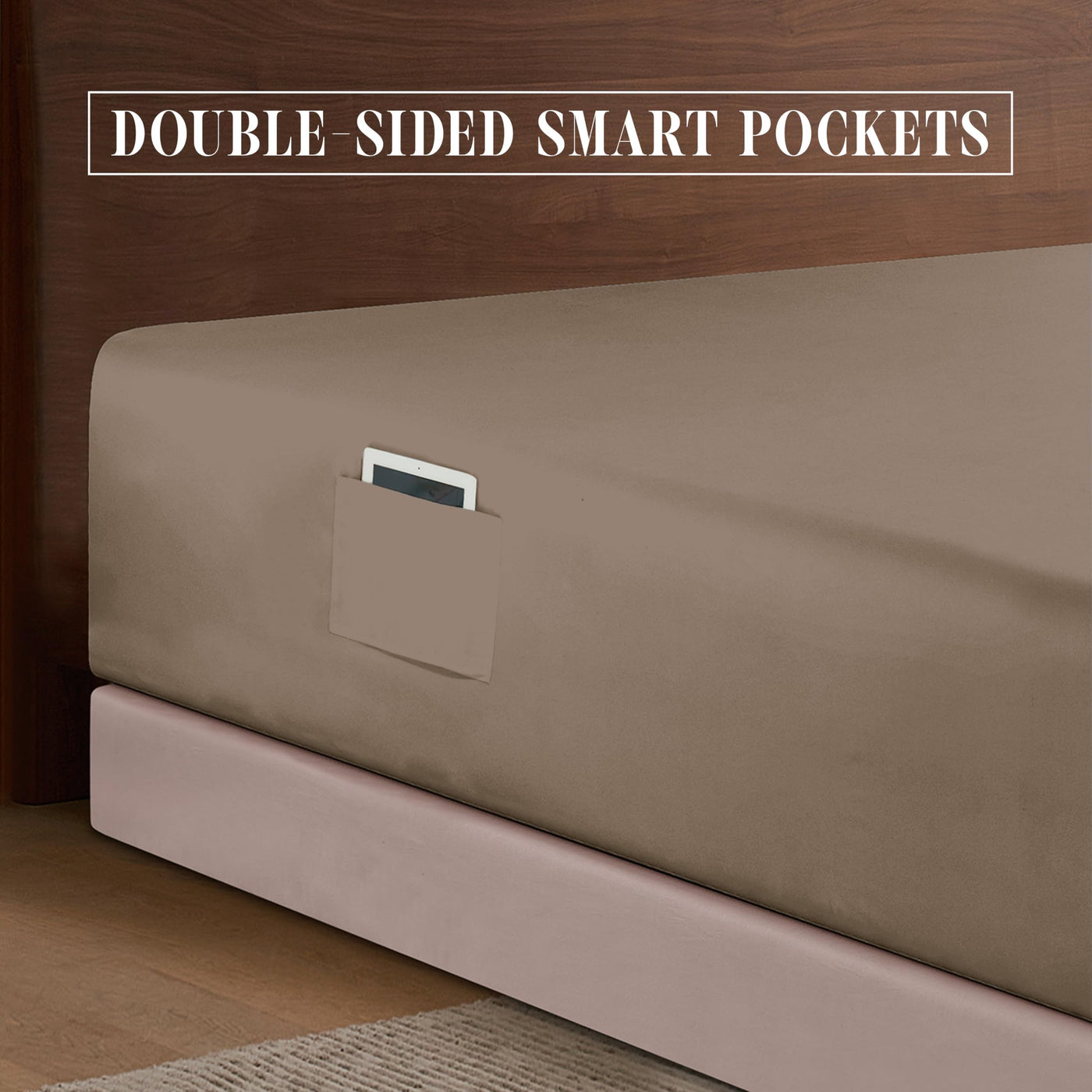 Upgrade your bedding with our Deep Pocket Fitted Sheet featuring Double-Sided Storage Pockets, designed for mattresses 18 to 24 inches deep. This premium fitted sheet is crafted from ultra-soft durable microfiber, providing a luxurious feel while offering a snug, secure fit that stays in place all night. The deep pockets easily accommodate thick mattresses, including pillow tops, memory foam and mattress toppers, ensuring a smooth and wrinkle-free surface. What sets this fitted sheet apart are the convenient double-sided storage pockets, perfectly positioned on both sides to keep your essentials within arm's reach. Store your phone, glasses, remote controls, books, or other nighttime necessities right beside you, eliminating the need for a bedside table. These pockets are designed to hold your items securely, offering easy access while you relax. The fabric is wrinkle-resistant, fade-resistant and machine washable, making it easy to care for while maintaining its fresh look and feel. Elevate your sleep experience with this practical and stylish fitted sheet, combining functionality with comfort.