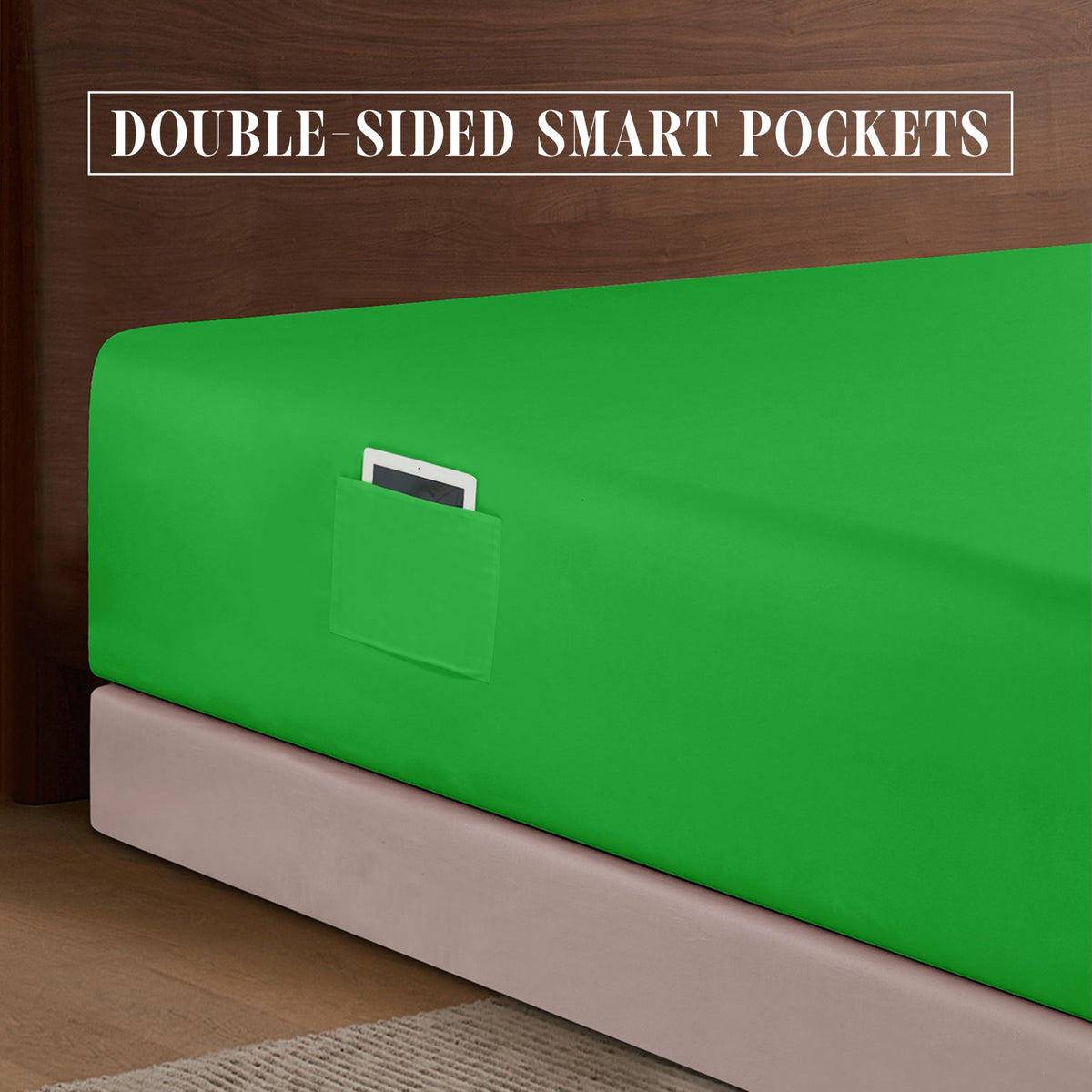 Upgrade your bedding with our Deep Pocket Fitted Sheet featuring Double-Sided Storage Pockets, designed for mattresses 18 to 24 inches deep. This premium fitted sheet is crafted from ultra-soft durable microfiber, providing a luxurious feel while offering a snug, secure fit that stays in place all night. The deep pockets easily accommodate thick mattresses, including pillow tops, memory foam and mattress toppers, ensuring a smooth and wrinkle-free surface. What sets this fitted sheet apart are the convenient double-sided storage pockets, perfectly positioned on both sides to keep your essentials within arm's reach. Store your phone, glasses, remote controls, books, or other nighttime necessities right beside you, eliminating the need for a bedside table. These pockets are designed to hold your items securely, offering easy access while you relax. The fabric is wrinkle-resistant, fade-resistant and machine washable, making it easy to care for while maintaining its fresh look and feel. Elevate your sleep experience with this practical and stylish fitted sheet, combining functionality with comfort.