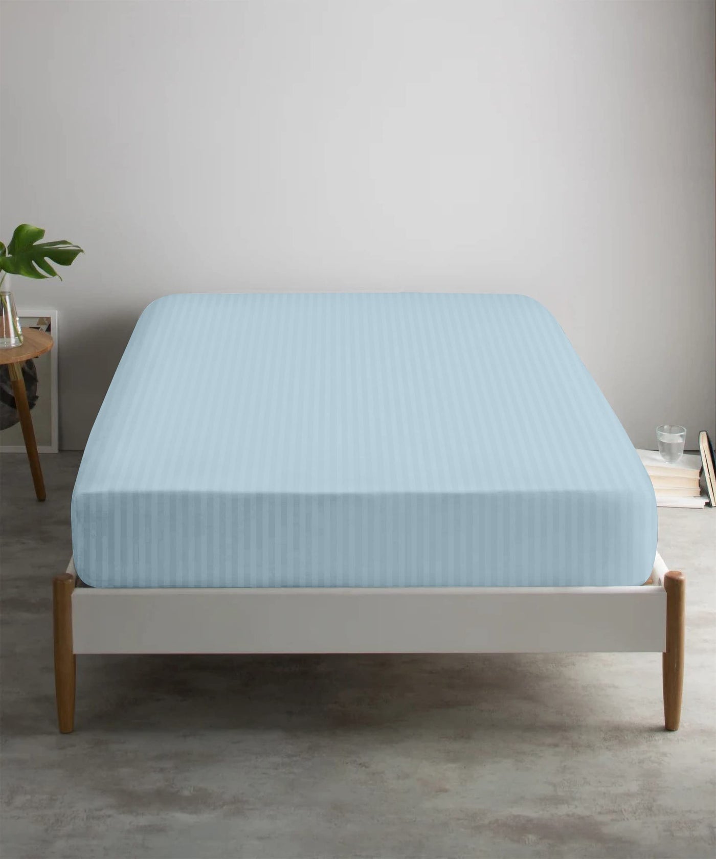 Feather & Stitch 1 Piece Damask Stripe Fitted Sheet Queen Size Aqua 500 Thread Count 100% Cotton Fitted Bottom Sheet 18 Inch Deep Pocket Stretchable Boxer Elastic Fit Mattress Perfectly