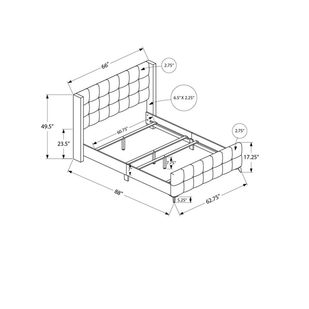 Create refinement and sophistication to your bedroom without losing the warmth, with this updated contemporary upholstered bed frame enveloped in an elegant grey linen-look fabric over foam padding on all sides. The box button tufting on the wingback headboard and footboard gives the whole bed added style. The bed sits firm on solid wood feet covered in the same linen-look fabric giving the bed a clean look with wink to modernity in the curved chrome metal feet attached to the footboard. A standard queen-sized box spring and mattress is required atop the wooden slats to fit inside this frame (both sold separately). All parts and assembly instructions are included inside the zippered compartment on the back of the headboard.