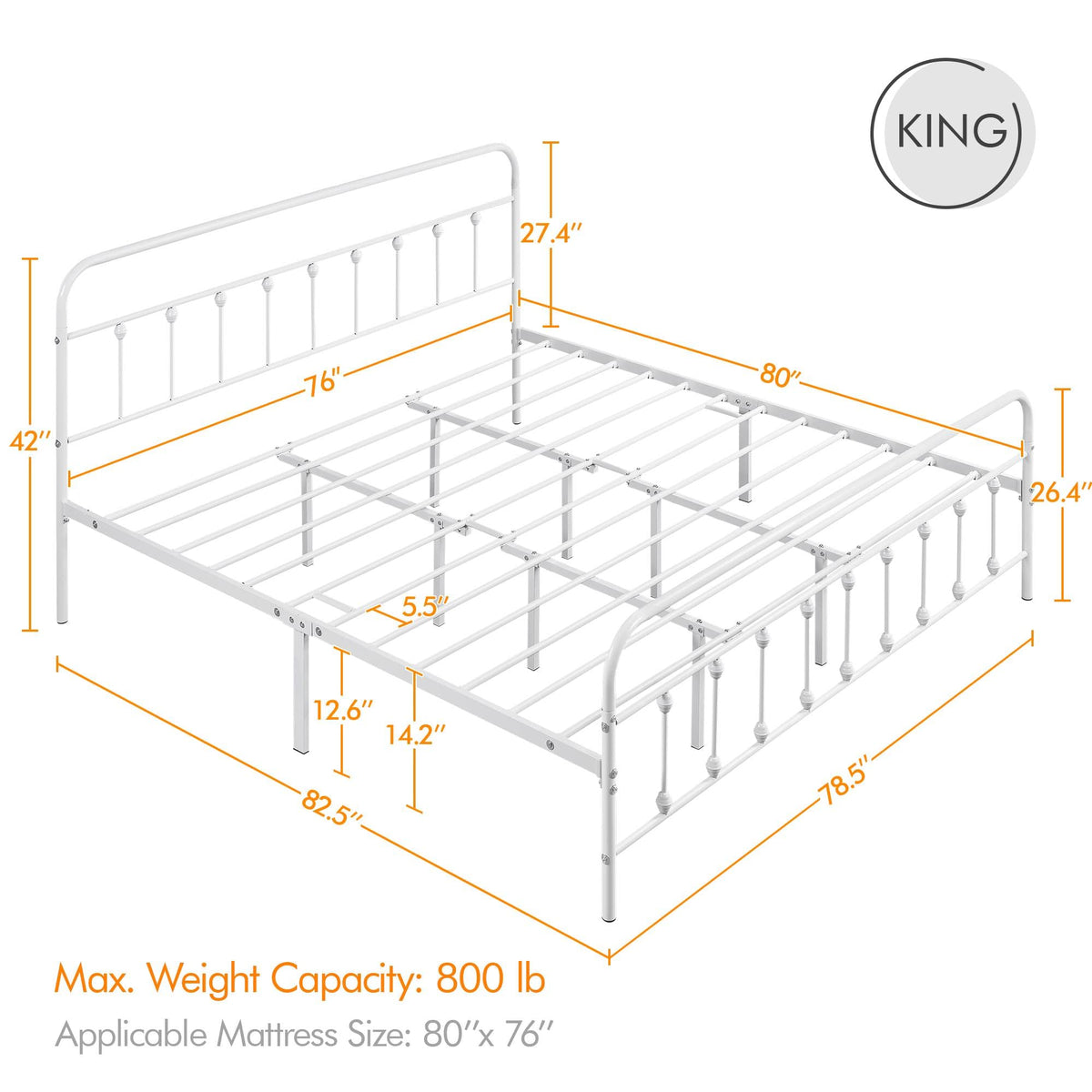 Overall Dimensions: 82.5' L × 78.5' W × 42' H Applicable Mattress Size: 80' L × 76' W Maximum Weight Capacity: 800 lb Ground Clearance: 12.6' Slat Spacing: 5-5.5'