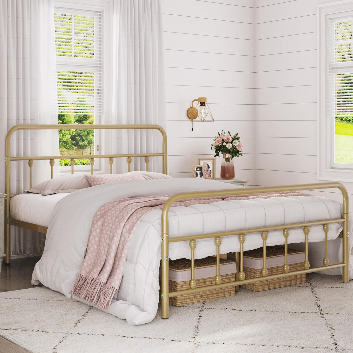 Yaheetech Classic Metal Platform Bed Frame Mattress Foundation With Victorian Style Iron-Art Headboard/Footboard/Under Bed Storage/No Box Spring Needed/Queen Size Antique Gold