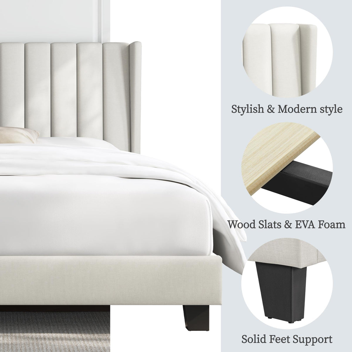 Classic Design: Classic simple geometric wing side style, channel headboard, and skin-friendly linen fabric, the queen upholstered bed frame is a stunning decor for your bedroom furniture, seriously upgrading your room's aesthetic. | Sturdy Wood-Metal Construction: Interior metal framework, 12 pieces of durable wood slats, and dense foam-padding border increase the comfort and durability of this queen upholstered bed with wing design. With a maximum weight capacity of 800 lbs. | Fabric Upholstered Headboard: Foam has been used to fill the bed's headboard, making it full and not easy to sag. The resilience brought by the foam fits the body and can effectively lessen the pain of minor bumps. | Effective Protection: This linen upholstered bed frame boasts thoughtful designs- protective foot pads made to protect your floor effectively and EVA foam on the center reinforced bearing bar helps minimize noise from any potential creaking and squeaking. | No Box Spring Needed: Require no bulky box spring or extra foundation. After assembling the upholstered platform bed with headboard, just put your latex, foam or spring mattress on the wooden slats, and everything is all set.