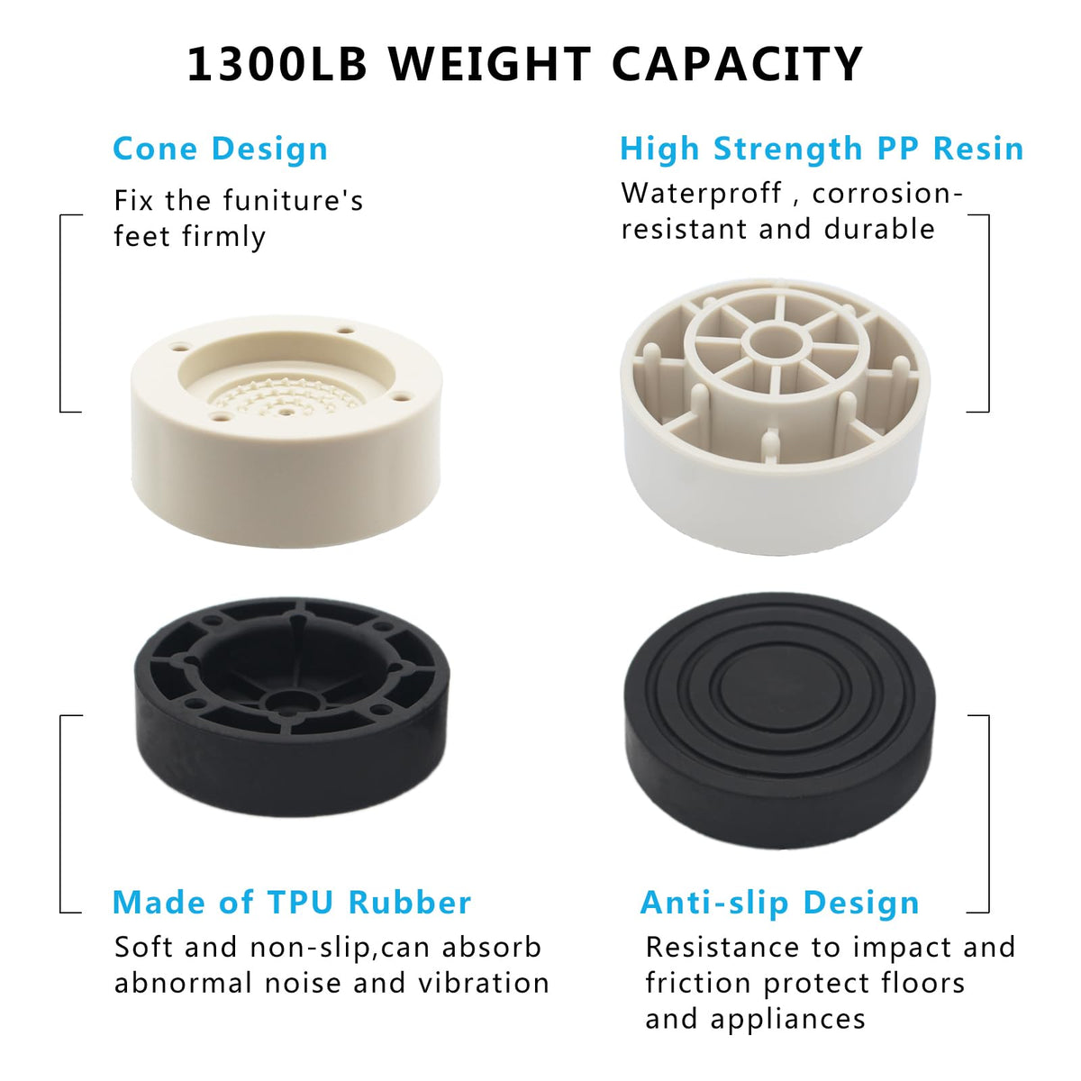 Q: What weight can the HANIHUA furniture risers support?A: The HANIHUA furniture risers are designed to support heavy-duty furniture with a weight capacity of up to 1,300 lbs, making them ideal for beds, sofas, and other heavy pieces.